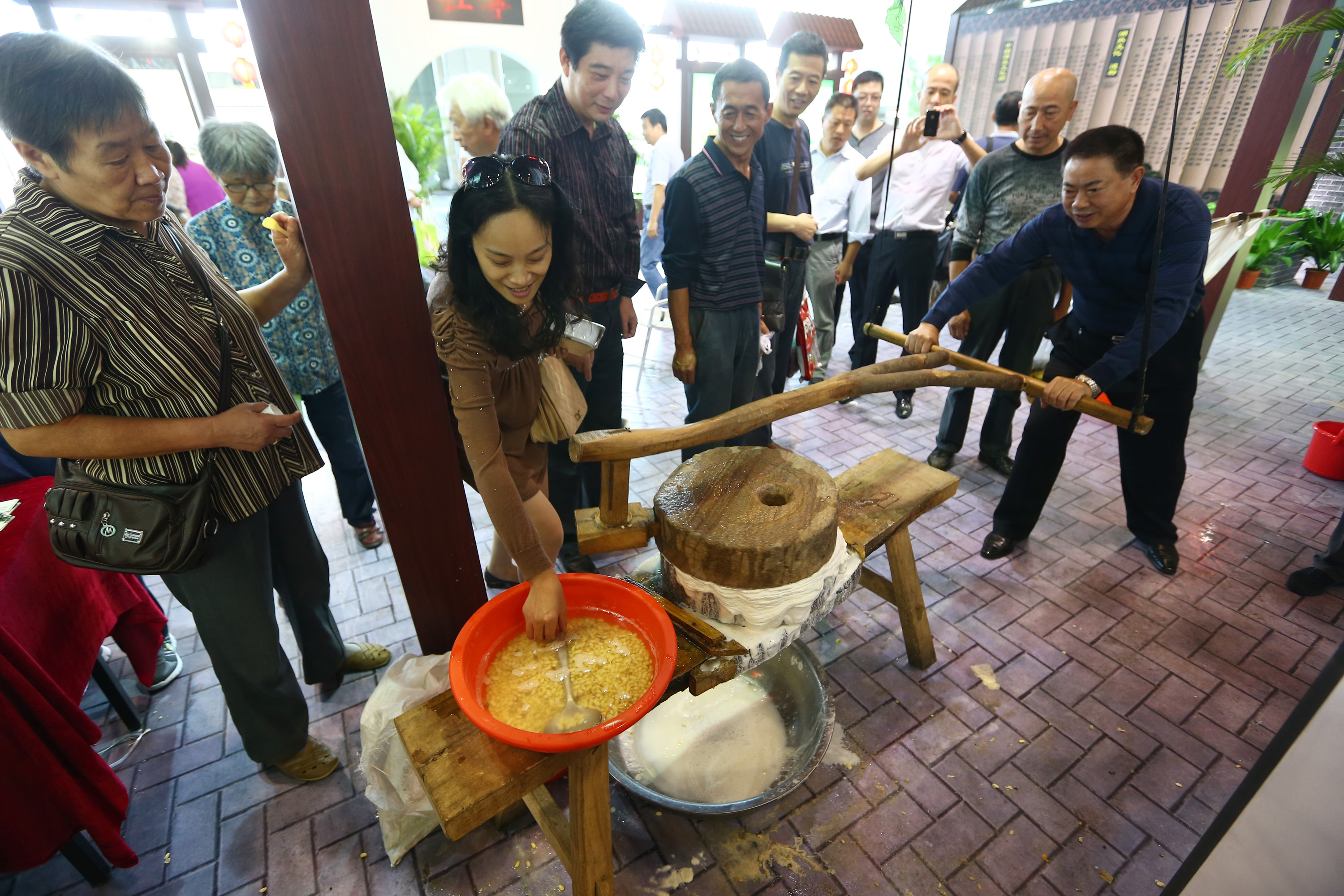 图为市民体验石磨豆浆,感受传统农业的乐趣。(图片来源:中新社)