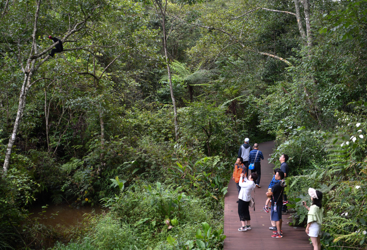 近年来,森林旅游在普洱兴起,生态资源与旅游产业融合发展。记者走进每平方厘米负氧离子达18000-24000个的小熊猫庄园,茂密幽深的原始森林中,游客正在观测长臂猿、小熊猫等野生动物。