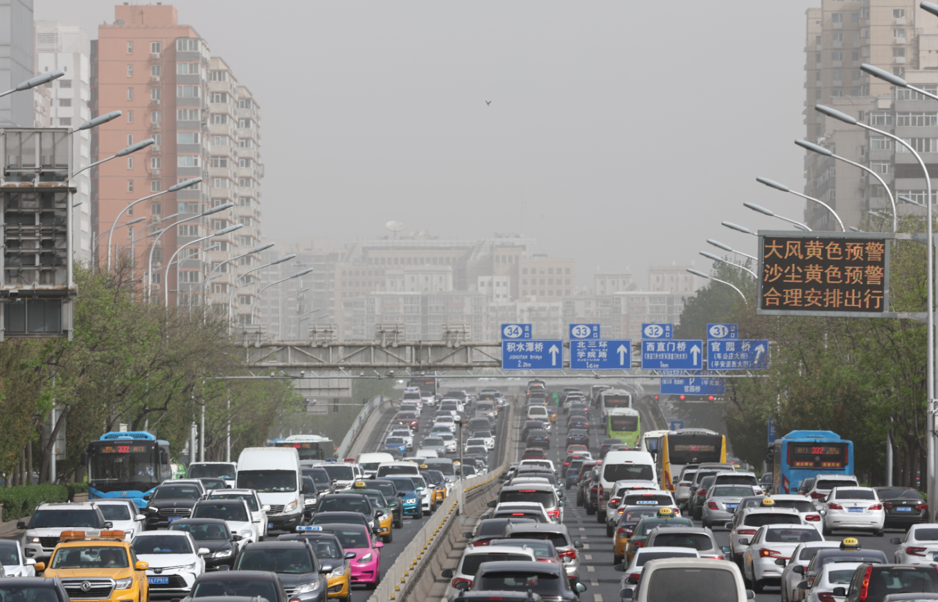 4月11日,北京遭遇大风和沙尘天气,车辆在沙尘中的西二环路上行驶。北京市气象台于10日20时升级发布了大风黄色和沙尘暴黄色预警信号。(图片来源:中新社)
