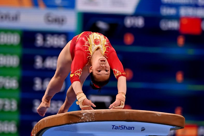 8月3日,第31届世界大学生夏季运动会体操项目女子团体决赛暨个人全能资格赛在四川成都开赛,中国代表队亮相赛场。图为中国队选手欧钰珊在进行跳马比赛。(图片来源:中新社)