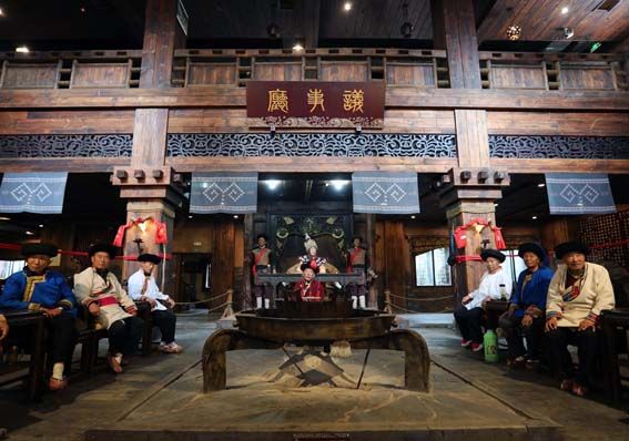 9月12日,位于四川省阿坝藏族羌族自治州茂县的中国古羌城内,身穿特色服饰的工作人员复原古代羌王议事场景。(图片来源:中新社)