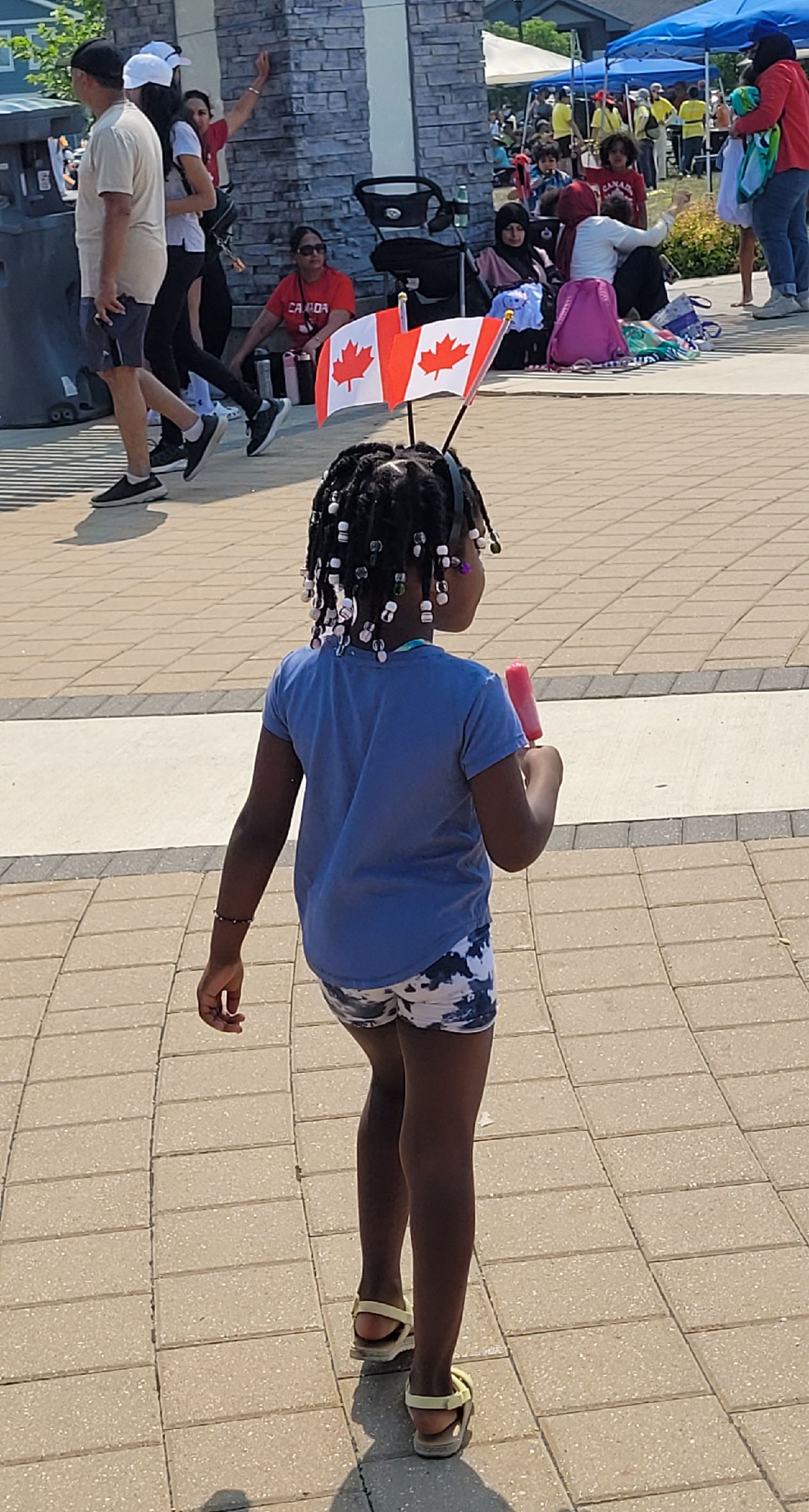 在BridgewaterLakes参加庆祝活动的头上戴国旗的小女孩