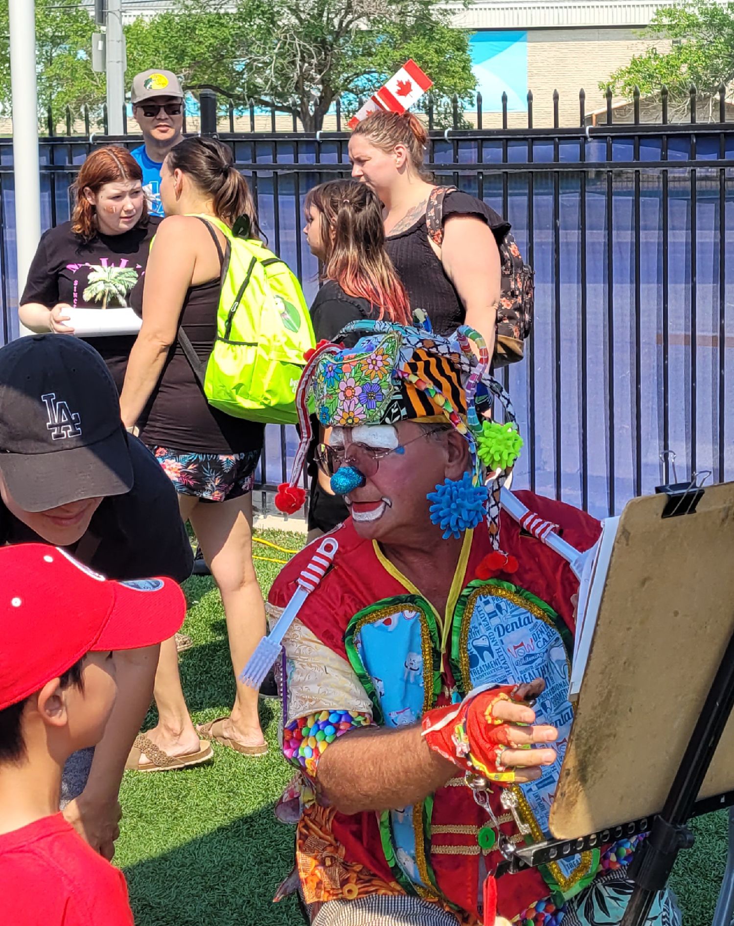 在PrincessAutoStadium小丑装扮的爷爷在给小男孩画画