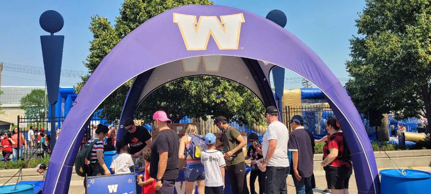 温尼伯橄榄球队BlueBomber的粉丝们在领取球队纪念品