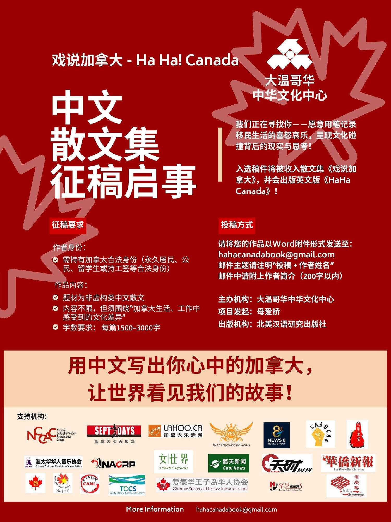 我们正在寻找你——愿意用笔记录移民生活的喜怒哀乐,呈现文化碰撞背后的现实与思考!入选稿件将被收入散文集《戏说加拿大》,并会出版英文版《HaHa Canada》。