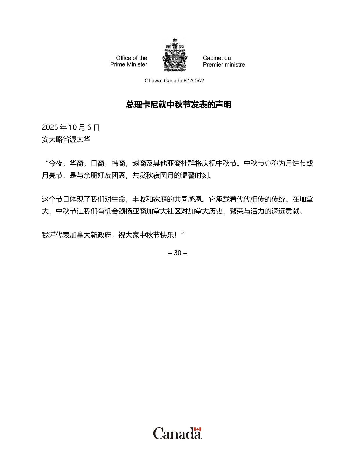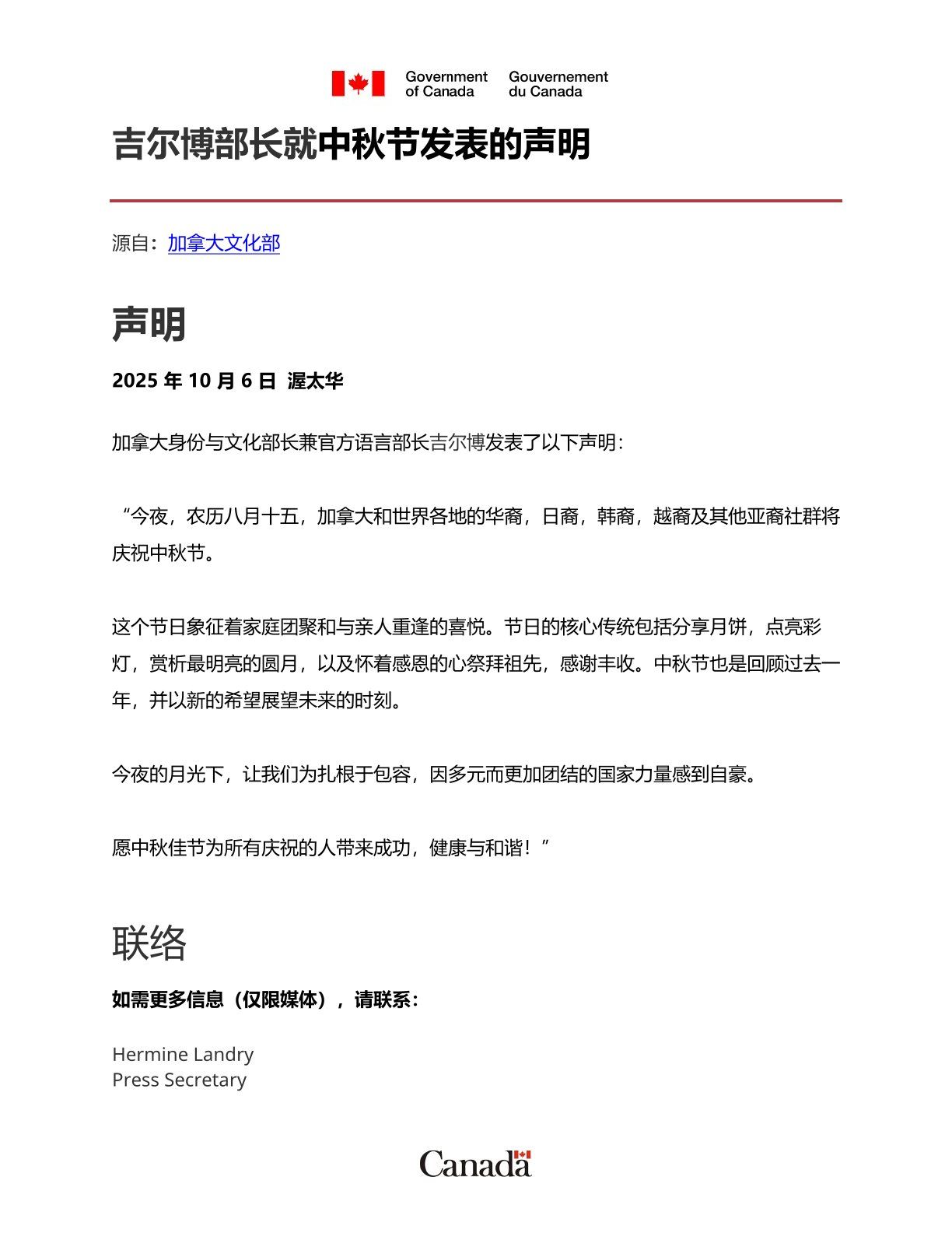 加拿大总理卡尼和加拿大身份与文化部长兼官方语言部长吉尔博就中秋节发表声明