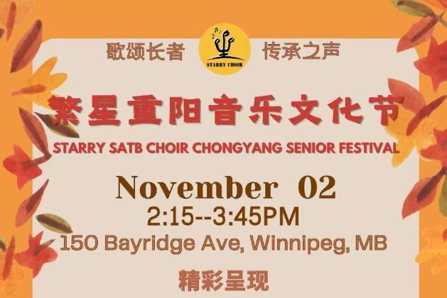 由繁星合唱团主办的“繁星重阳音乐文化节”(Starry SATB Choir ChongYang Senior Festival )于2025年11月2日在温尼伯成功举行,参与文化节的除了有老年人,还有众多儿童观众并参与演出活动,丰富了温尼伯华人的文化生活,为温尼伯的华人老年人带来了节日的祝福。