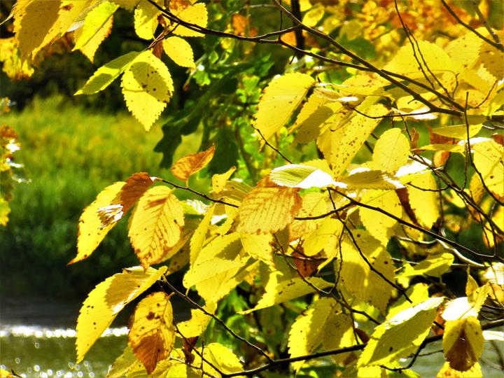河边的小树枝挂满了五颜六色的·枝叶,