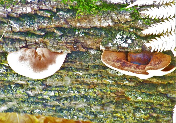 这个倒下的大树皮的间隙里还长有林芝,不知跟国内入药的灵芝是否是一回事,反正在这没人注意它们的存在。