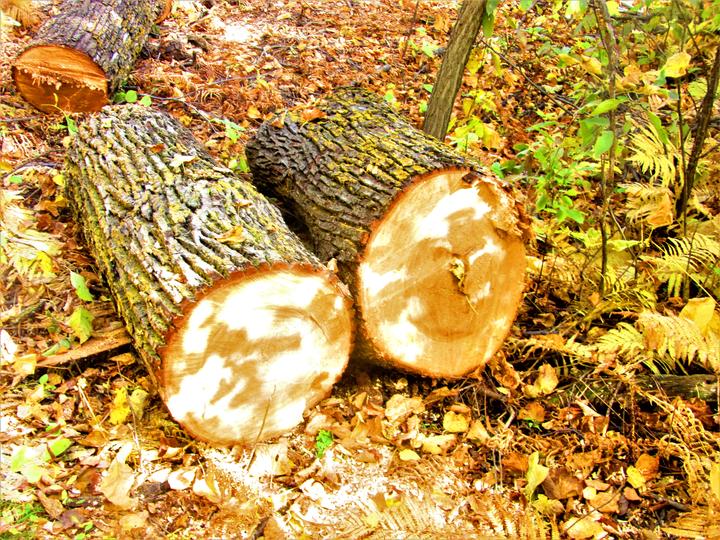 这树林里有很多倒了的树,工作人员为了不影响游人的走路,很快会把断树锯成小段,回头拉走,