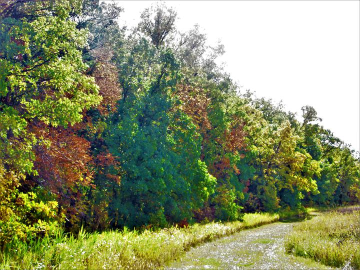 在旁边的小路上行走,能看清五颜六色森林的全貌,