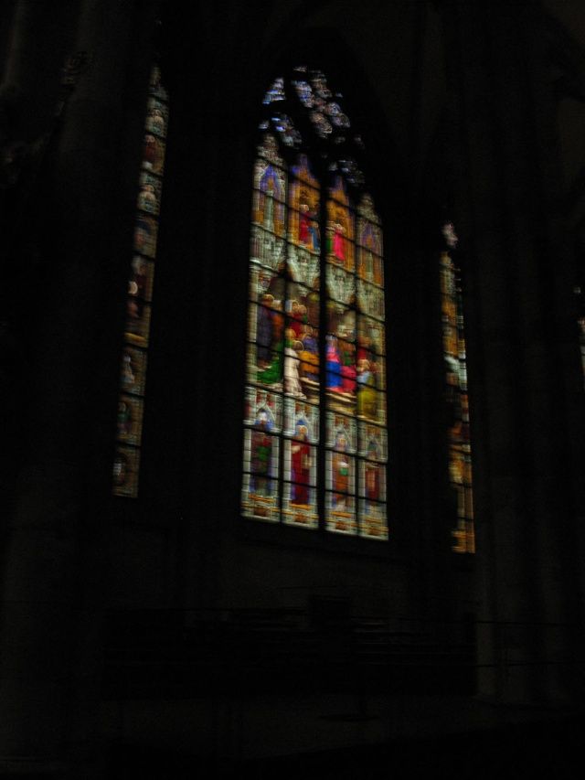 教堂四壁窗户,总面积达1万多方米,全装有描绘圣经人物的彩色玻璃,