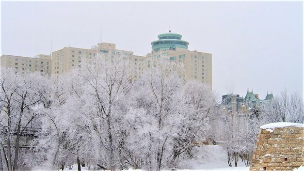 温尼伯最著名的高级旅馆,被挂着雾凇的树木包围,增加了建筑的庄严感,