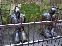 正对石墓有与岳飞被杀有关的秦桧、王氏、万俟卨、张俊等四人跪像,为白铁铸造。四人像均无上衣,袒胸露乳,低头面向石墓。