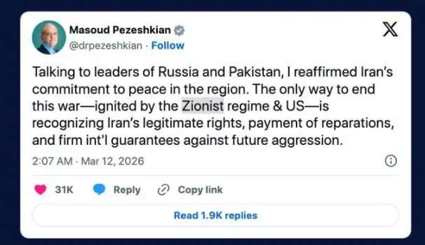 伊朗总统佩泽希齐扬11日晚在其社交平台发文,公布伊朗结束与美国、以色列战争的三大“条件”。