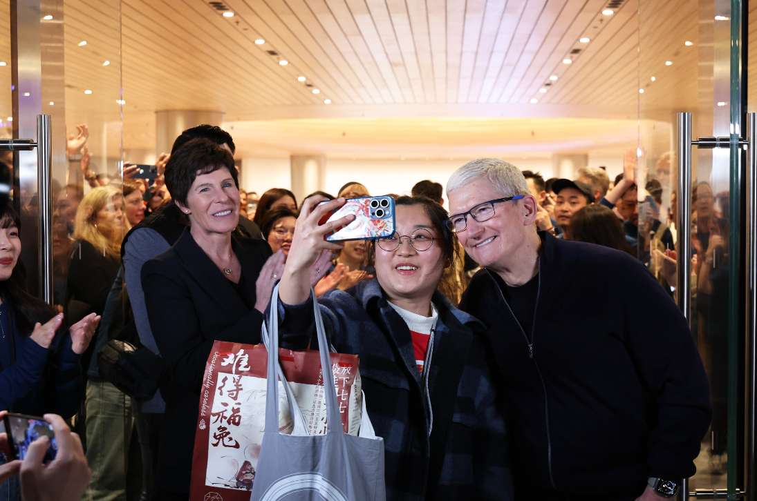 2024年3月21日,上海,库克和顾客合影留念。当晚,苹果公司首席执行官蒂姆·库克在上海参加苹果静安零售店开业仪式。(图片来源:中新社资料图)