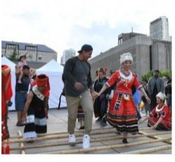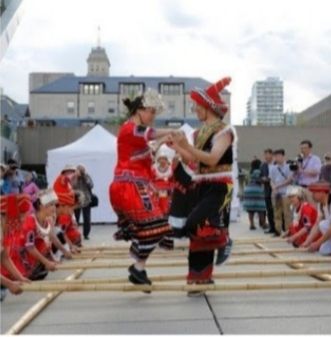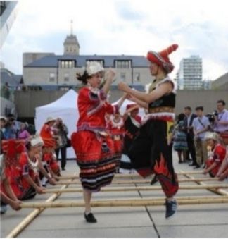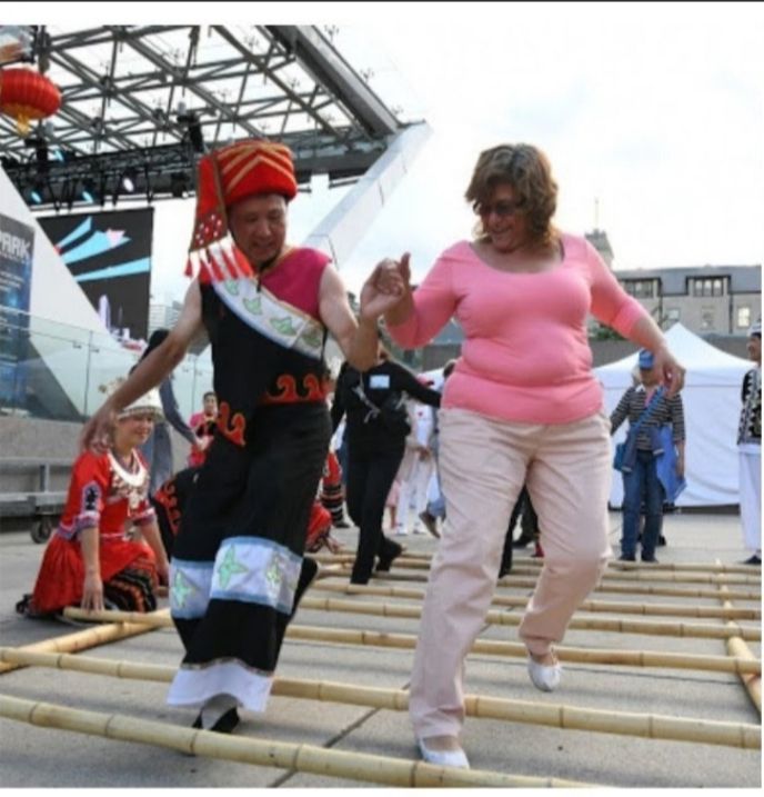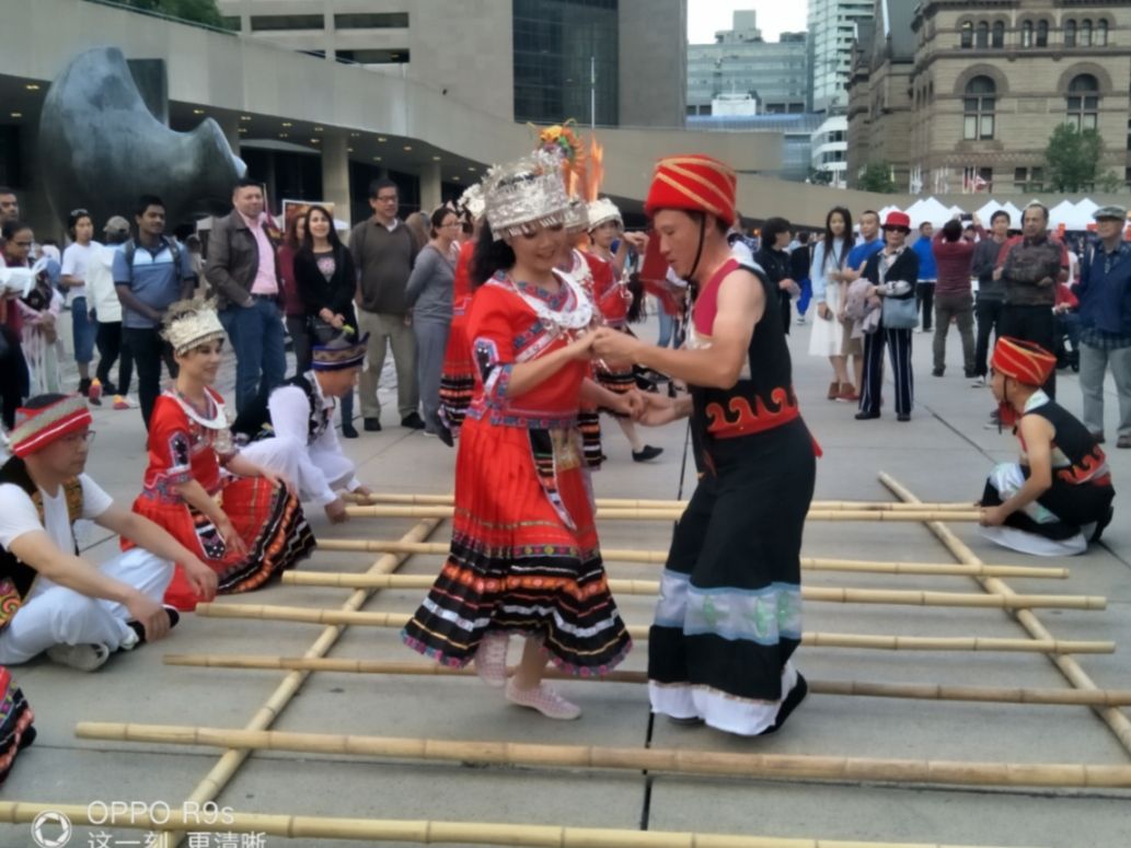 当时的密市华人艺术团团长刘霞带领艺术团团员们编排的这个竹竿舞,不仅受到龙文化节组委的重视,也确实以它的民族特色、艺术性和互动性受到观众们的特别喜爱,成为龙文化节上的一个独具特色舞蹈项目,那一届也受到驻多伦多总领事馆的特别奖励。在舞台上,他们身着艳丽的民族服装,在特别浓郁的民族音乐声中,在“嘿!呵嘿!”的高声呼喝声中,变换不同组合、不同跳跃方式和不同节奏,姿态优美地展现出这个既传统又艺术的舞蹈。在广场上,他们带着游客们跳, 在和游客的互动中把这个传统民族舞蹈的知识点以及快乐带给大家。