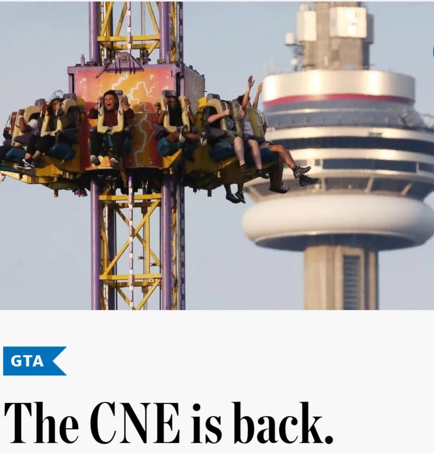 而对于大多伦多地区和周边社区的许多人来说,CNE是一年一度的家庭聚会游玩传统。为期18天的博览会除了上述展览,还包括购物区、现场娱乐、体育活动、音乐会、马术杂技、赌场、大型嘉年华会,儿童乐园,特别是似乎人人都爱的食品展。