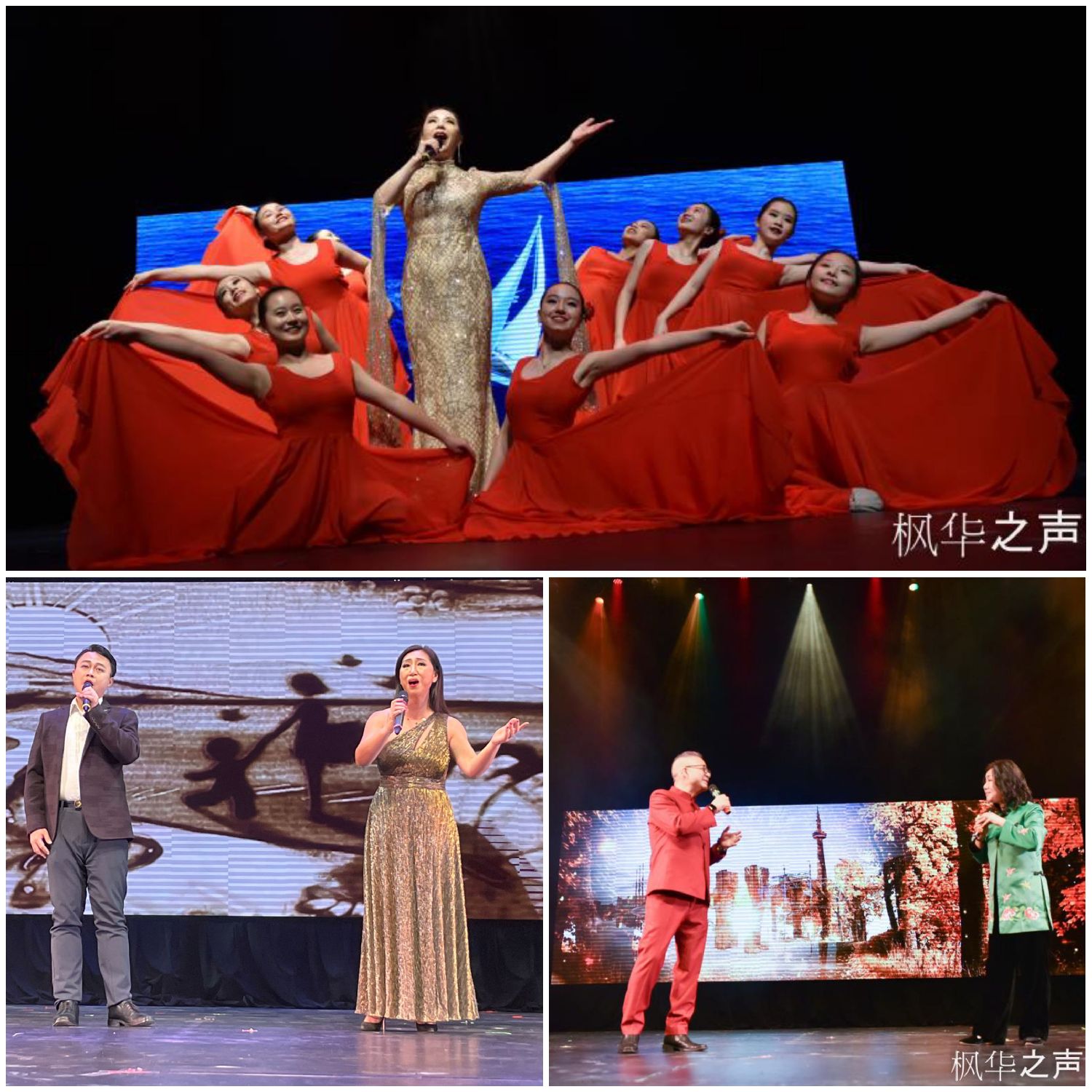 女高音歌唱家郑月秋(上)、二重唱<<当你老了>>(下左 彭欣、李晓东)、粤语怀旧对唱<<片片枫叶情>>(阮国衡、Jennifer 钟)