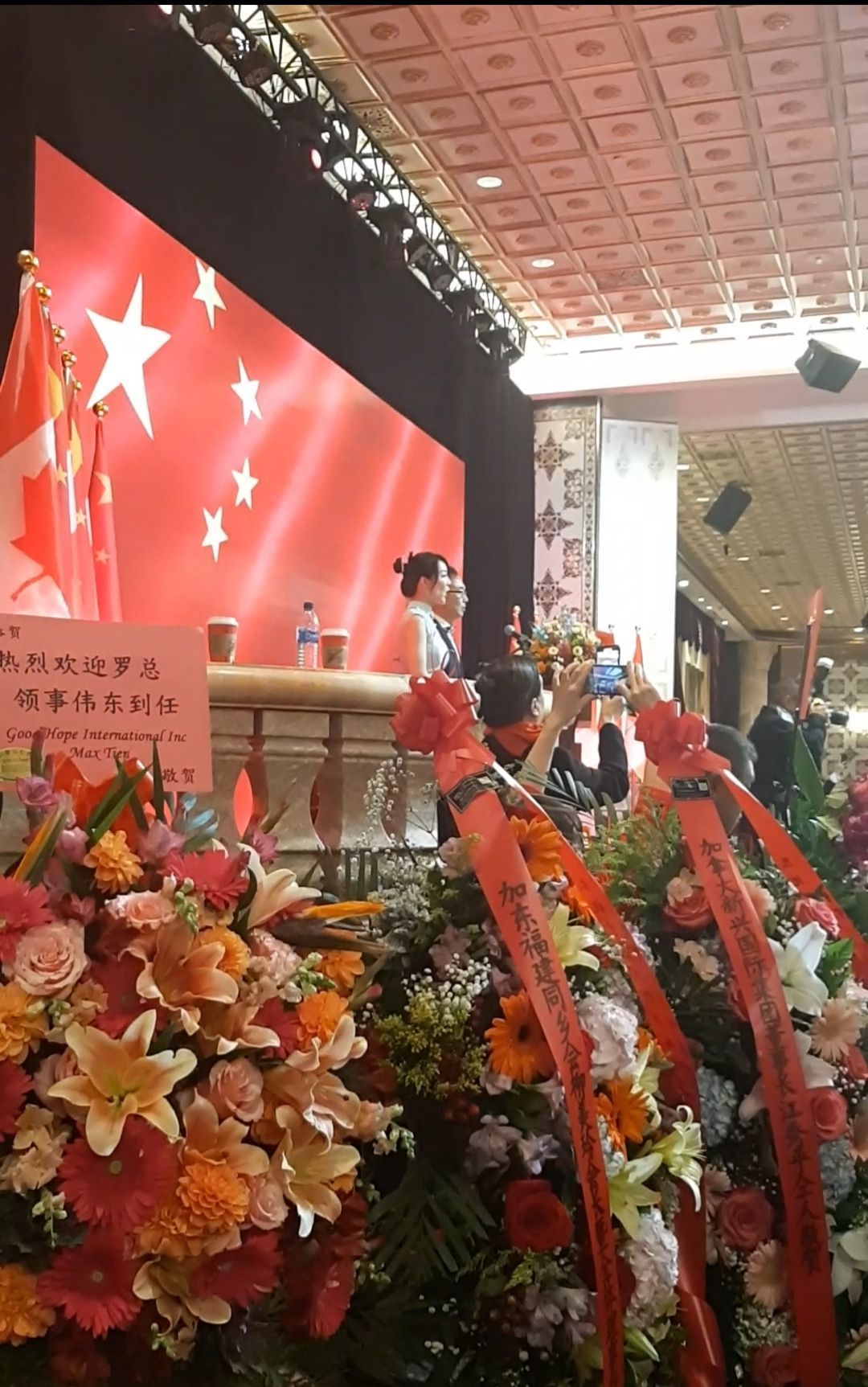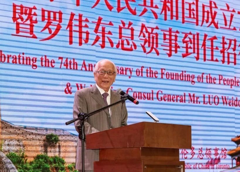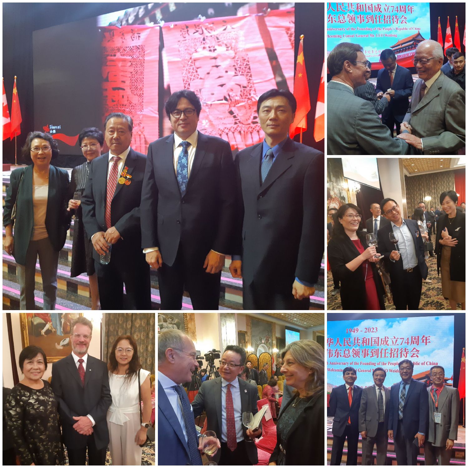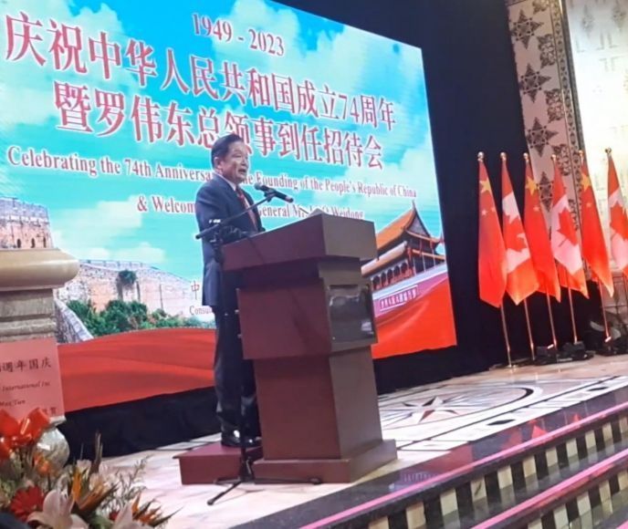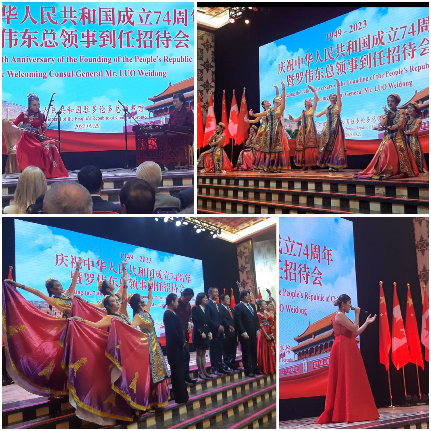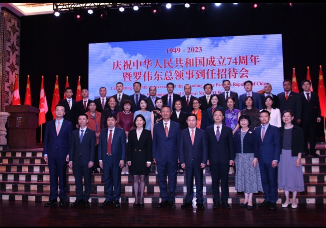 9月29日晚,中国驻多伦多总领事馆在多伦多钓鱼台国宴举行国庆暨罗伟东总领事到任招待会,庆祝中华人民共和国成立74周年。