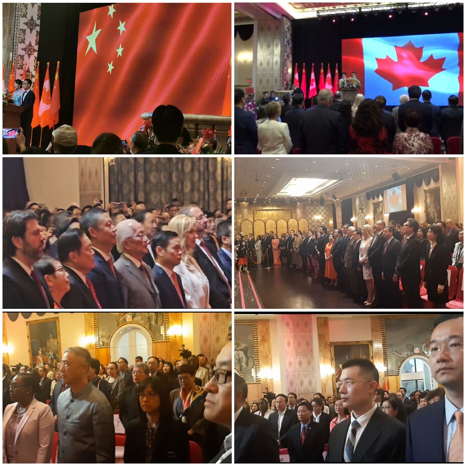 国庆招待会现场,华灯璀璨,主舞台两侧布满鲜花。招待会由郭然和周佳共同主持,在中加两国国歌声中正式开始。