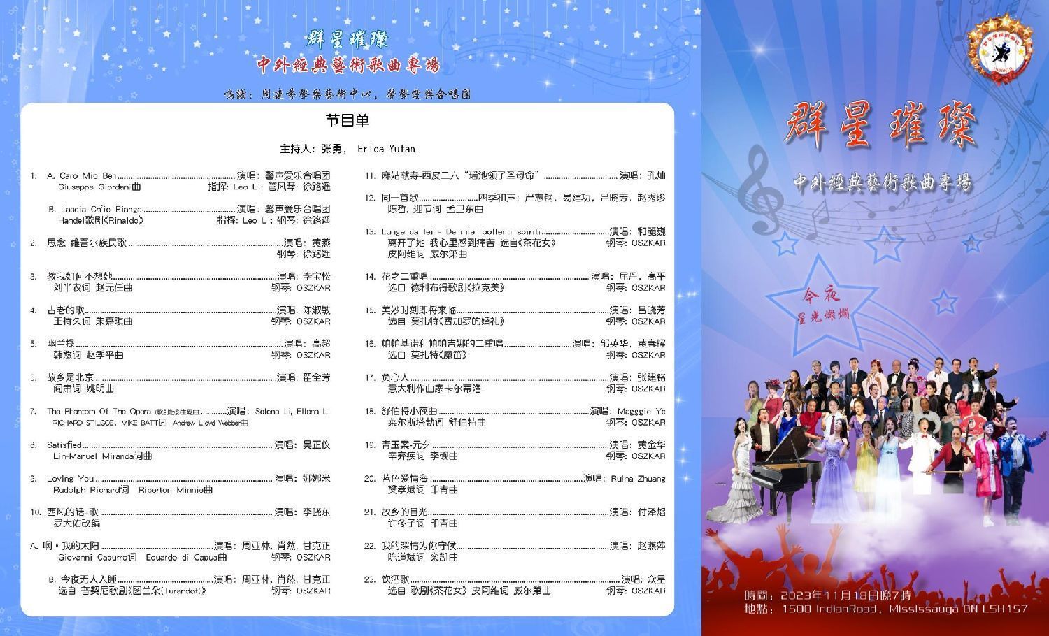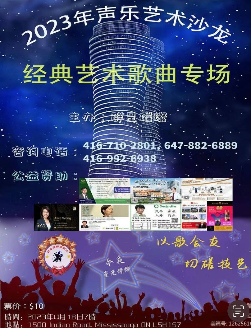“群星璀璨演唱会”于2018年开始创办,至今已有六个年头(因疫情停办了三年)。它的诞生和存在,可以说是填补了大多伦多作为一个国际化大都市应该有大型歌友会(或沙龙)这种民间文化形式的空缺,正如日本、台湾非常盛行的歌友会。今年之前,每年仅一场“春天里的歌友会”,因为歌友们喜爱的热度与日俱增,今年开始,“群星璀璨演唱会”内容递增,更加丰富,参与歌者更多,扩展成为“春、夏、秋、冬四季歌友会”共四场。昨日之前已经成功举办了三场:2月18日的“影视歌曲专场”,5月13日的“中外流行歌曲专场”,和8月19日的“民歌专场”。昨晚的第四场,是“中外经典艺术歌曲”专场,也是本年度最后一场----金压轴。