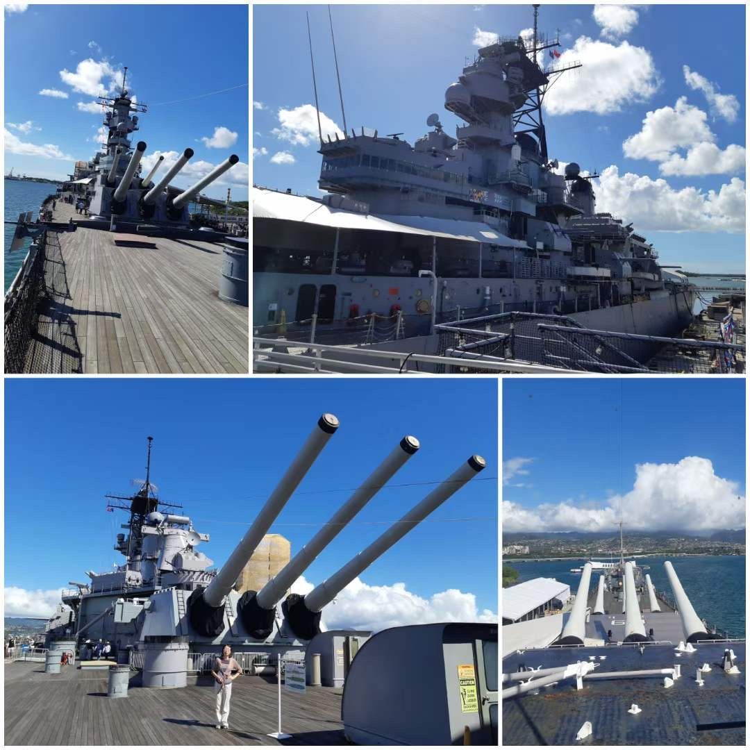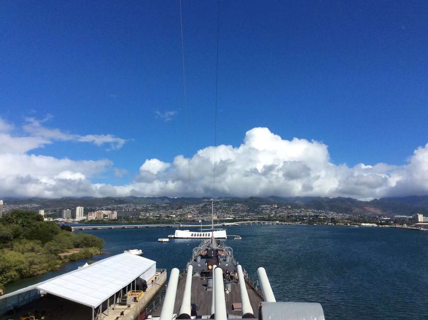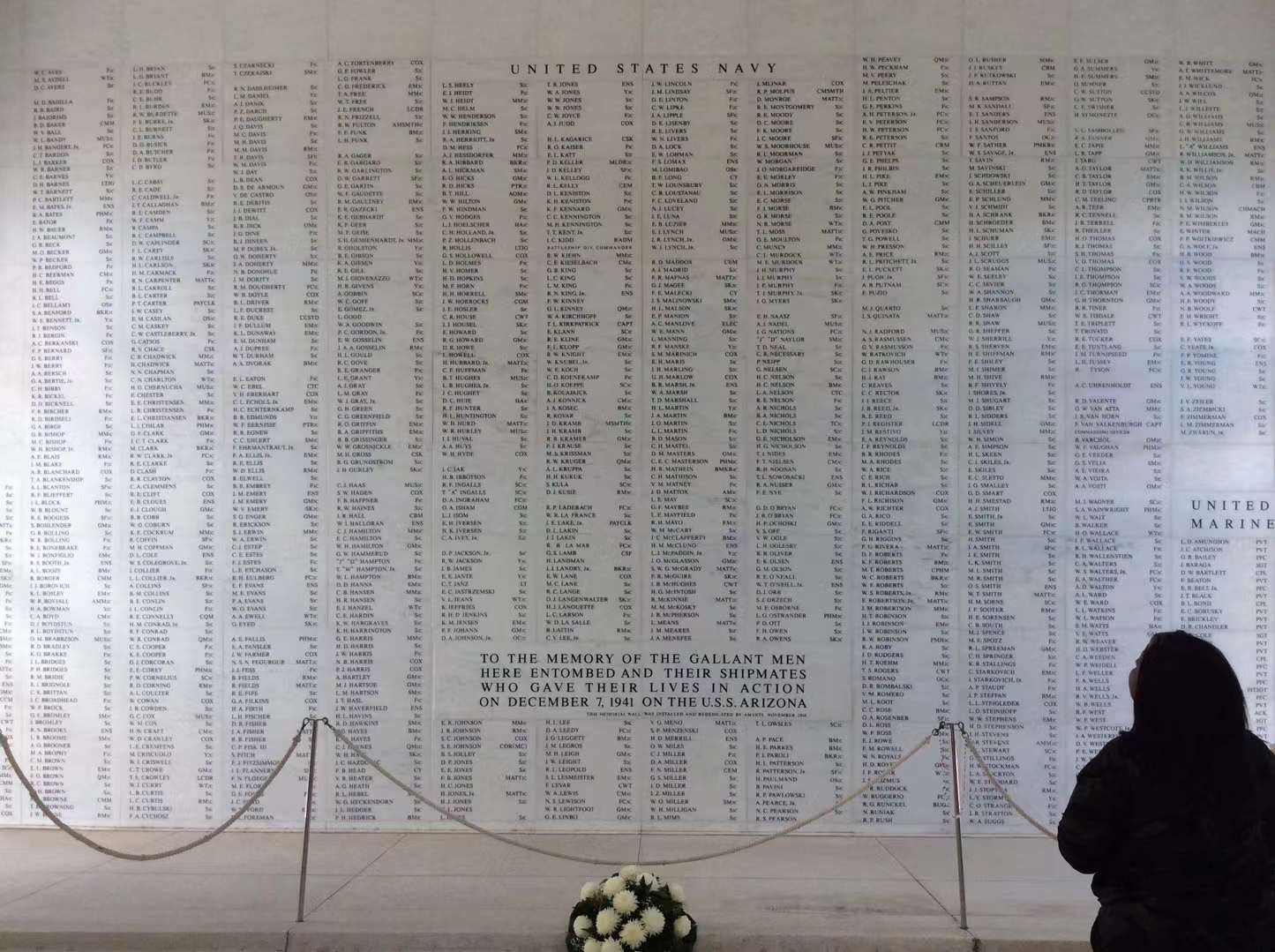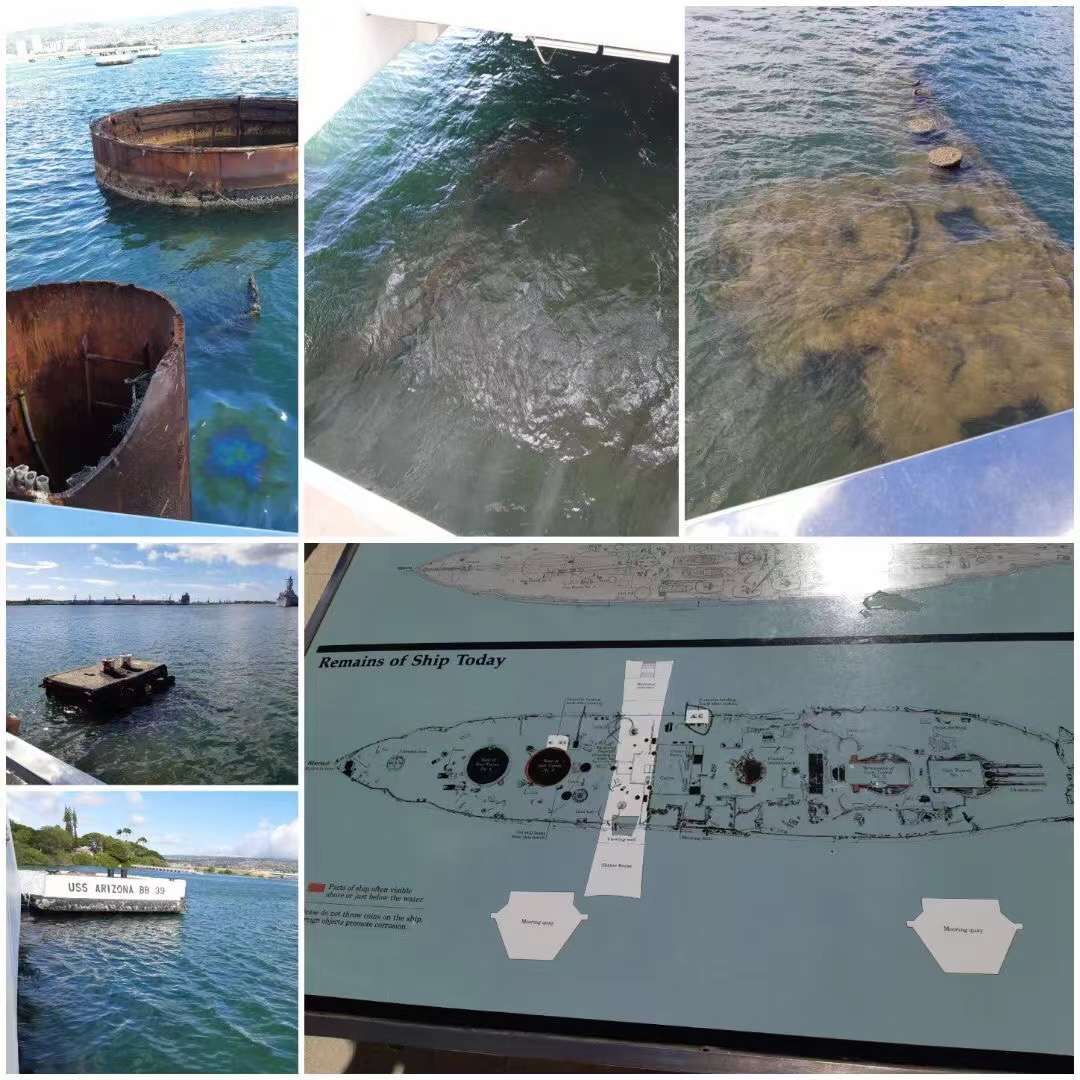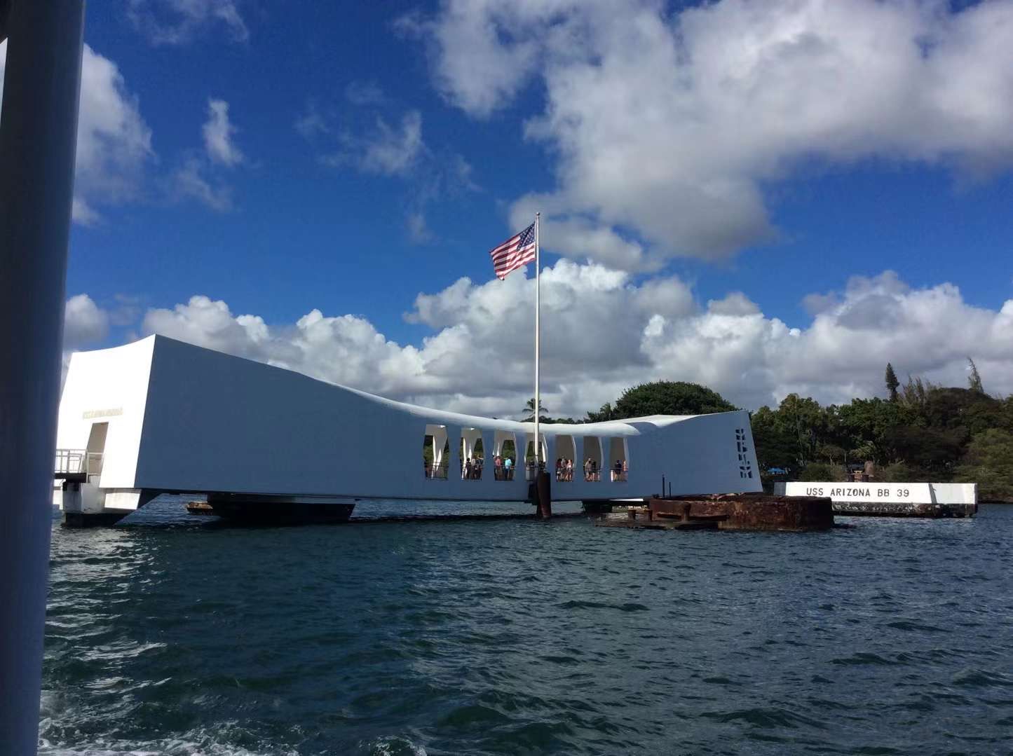 我们来到了亚利桑那号战列舰纪念馆。从珍珠港游客中心,乘坐海军的摆渡舟来到纪念馆。在珍珠港袭击中被击沉的亚利桑那号战列舰(USS Arizona BB-39)残骸正上方的紀念館,建筑本体就在残骸之上。它是一个白色长方形建筑体,在两边和天花板上镂空,天花板开了7个大窗户,代表纪念亚利桑那号沉没于12月7日,两侧总共21个窗户则代表21声至高礼炮,象征对亚利桑那号和珍珠港阵亡将士的最高致意。和其它纪念馆不同,这里也是军人公墓。珍珠港事件造成2,403人阵亡,因为当年无法找到用“保持遗体尊严的方法”将遗体移出残骸,所以仍然有1102具阵亡将士的遗体永远留在了残骸里。摆渡的海军工作人员告诉大家,沿途不得使用手机,不得拍照,到了纪念馆就可以拍照了。在水上的纪念主馆末端,有阵亡将士名录墙,墙上陈列出了珍珠港事件中全部阵亡将士的名字,整整一堵墙。人们默默地,在不大的纪念馆里观看着,无人喧哗,只听见太平洋上的风将那面美国国旗吹得猎猎作响,那正是当年亚利桑那号战舰的战旗飘扬的地方。