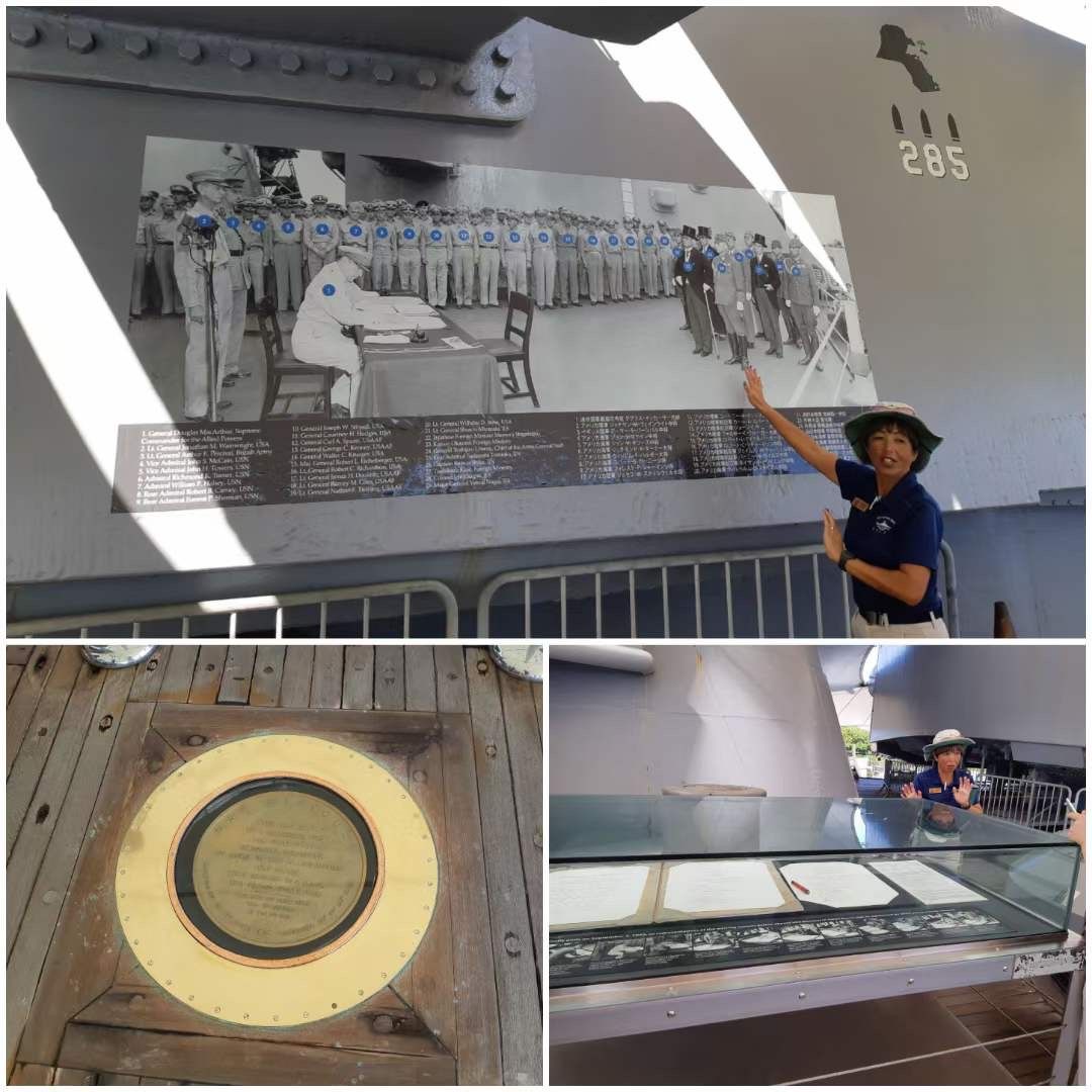 那张不大的签字桌的地点圈住了起来(上图左下), 举行仪式的侧甲板并不大,可是当年的那一刻,不仅是美国的荣光,也引起了举世的欢腾。由密苏里号守卫亚利桑那号,正是对英灵们最好的告慰。