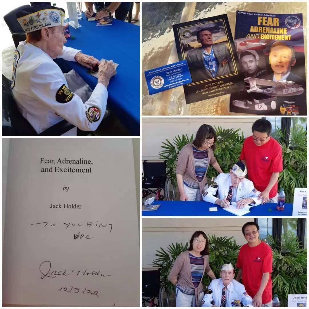 参观两艘战列舰的间隙,非常幸运的,我们看见一位身着海军军装的老兵正在为游客签名,桌子上写着“珍珠港幸存者”字样。老兵叫杰克(Jack Holder),在他94岁的时候写了一本书《Fear, Adrenaline, and Excitement》,讲述他见证的历史。因为高龄,杰克只在这里停留一小时。我们排上队,先生赶忙到书店买了他写的书请他签名。再过几天,1921年12月13日出生的杰克就101岁了。老人精神饱满,但有点耳聋。杰克在书里写到,珍珠港事件发生时,他是刚服役一年的19岁的海军航空兵。1941年12月7日,星期天的早晨7:55分,他突然看到涂着太阳的飞机群呼啸而来。同伴大吼,到飞机库后面的排水沟去!他们迅速潜入水中,日军战斗机机枪的低空扫射猛烈又密集,飞机是如此地靠近他,他甚至看见飞行员咬牙切齿的脸。杰克永远不会忘记那张狰狞的脸。