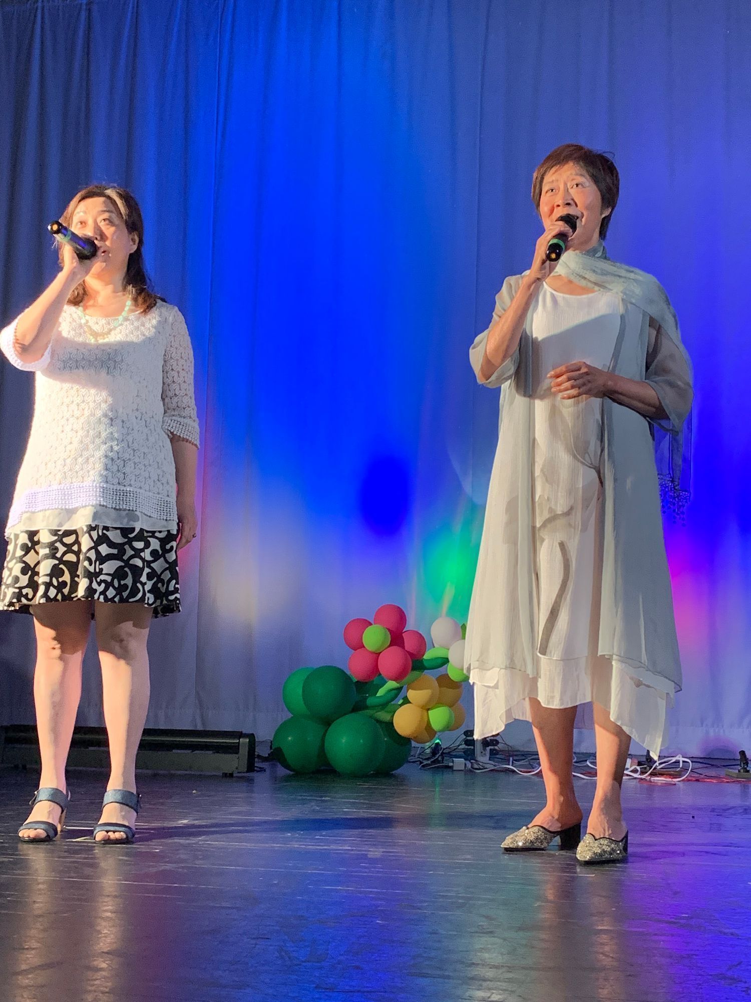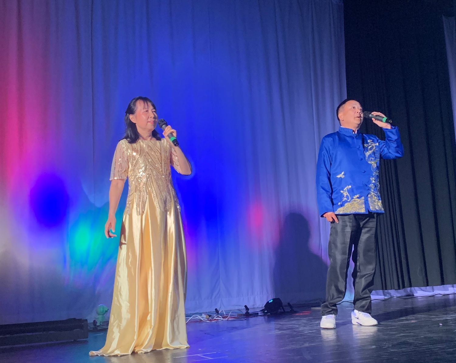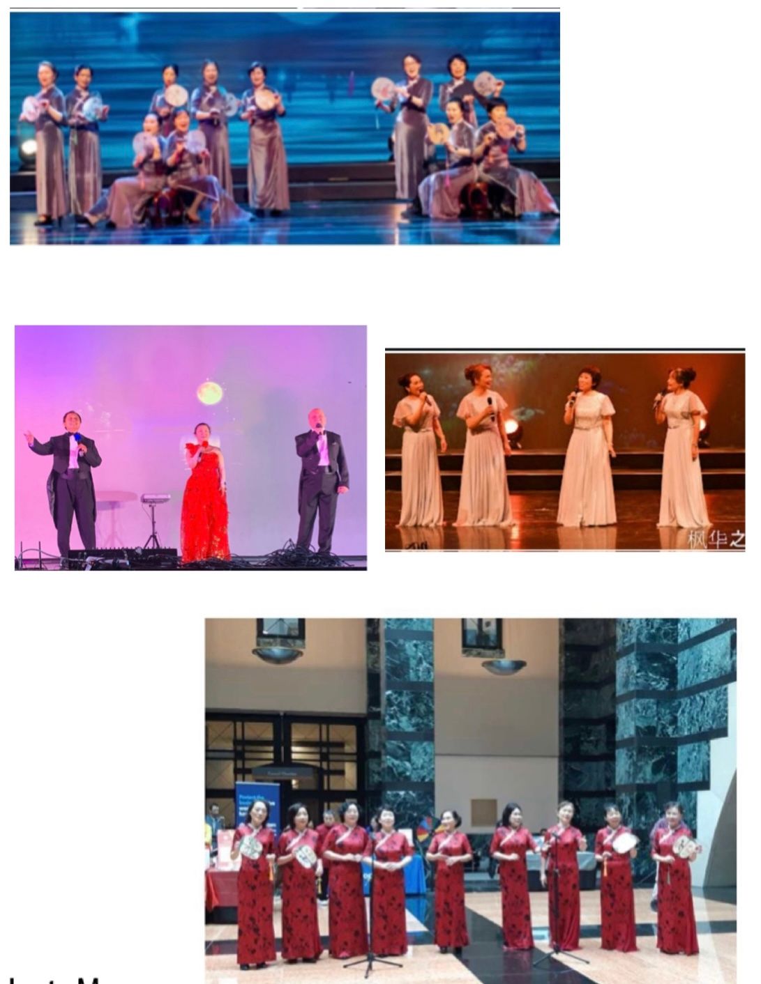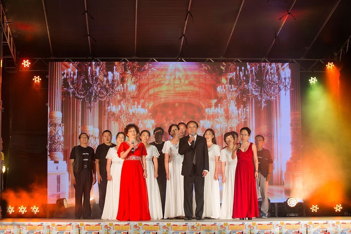 这张早期演出照片,左边两位是密市华人艺术团建团时期元老级老歌唱团员、东北大学高级工程师陶继华、凌茜夫妇,现在已80多高龄,早已淡出舞台。在2022年一次户外活动中,两位长者的回访和讲话,表达出他们对艺术团怀的深情和厚望。当时凌茜女士还在陶老手风琴伴奏下,给大家中英双语演唱了他们精心挑选的曲子《友谊地久天长》。他们的资性和艺术气质,和他们的讲话,成为艺术团关于歌唱的感人印象和深刻的记忆。