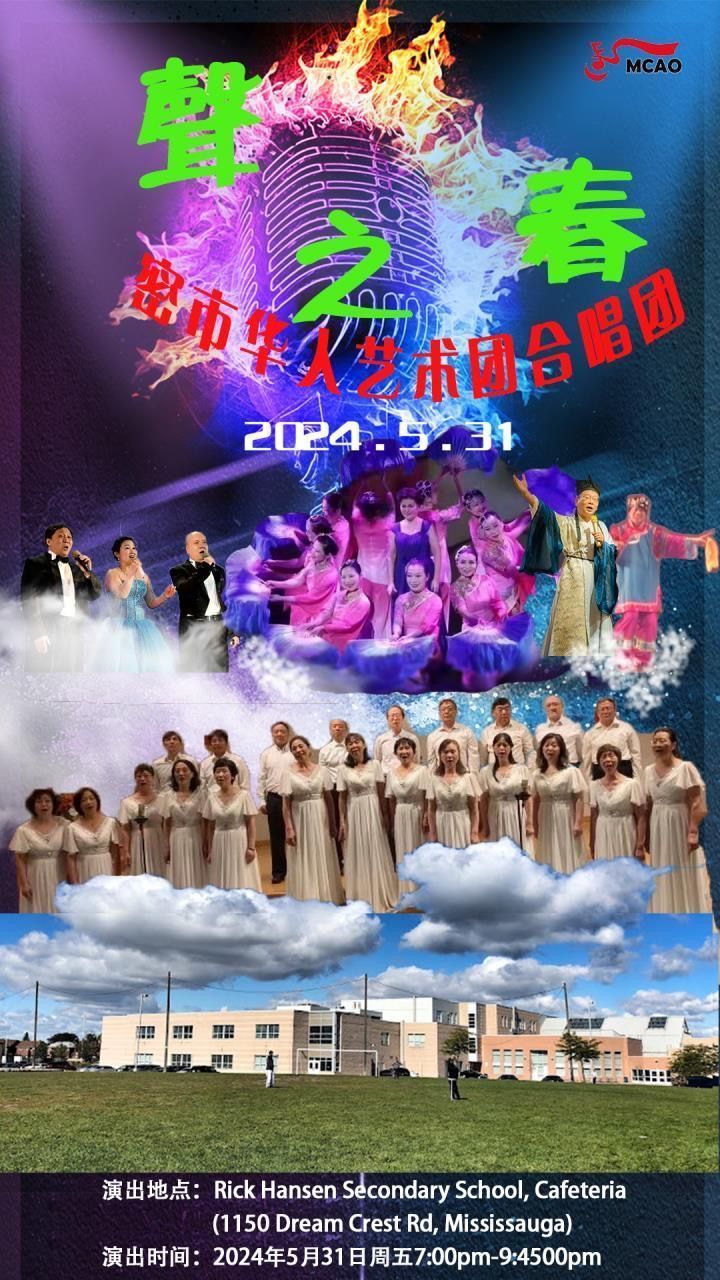 密西沙加市华人艺术团(Mississauga Chinese Arts Organization—MCAO) 声乐组(也称合唱团)于5月31日星期五晚7点在本地Rick Hansen中学礼堂(1150Oream Crest Rd,Mississauga)举办了《声之春》团内音乐会。