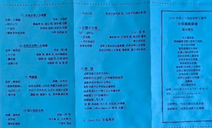 今年来自多伦多及多伦多周边地区(Toronto, Mississauga, Guelph, Hamilton, London, and Waterloo ) 的十四个合唱团参加了合唱音乐会演出。