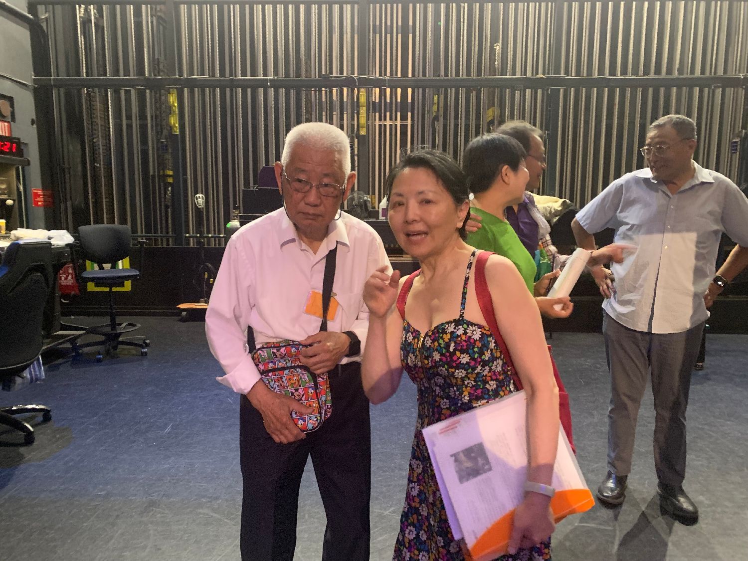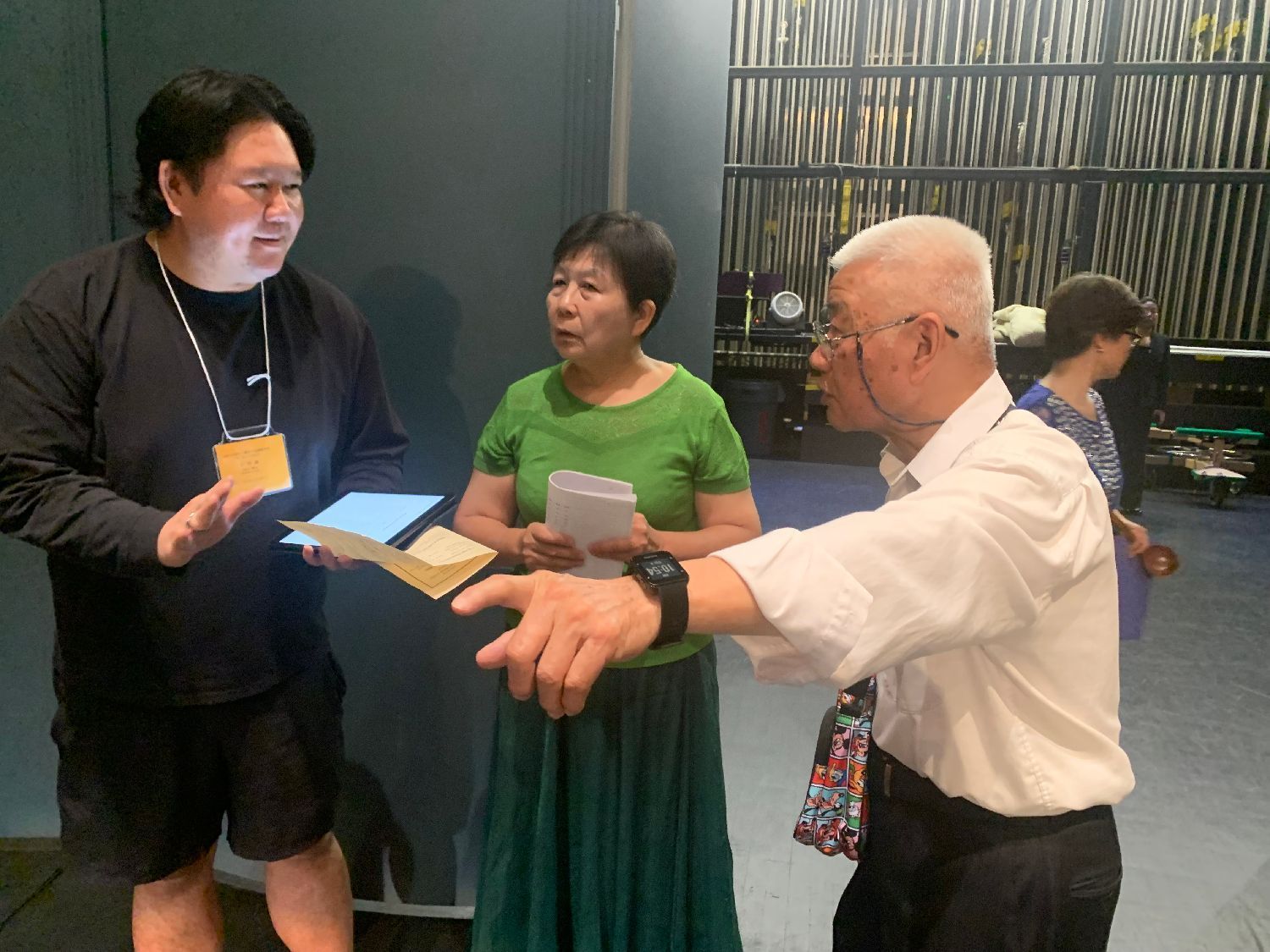 毛群博士和指挥谢秀贞商讨彩排走台事宜