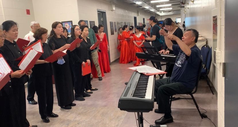 王燕樵演出前在后台指导多伦多华人合唱团练唱