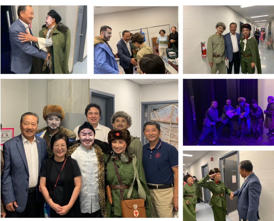 加拿大华人文化艺术团体联合会主席张俭中场休息时到后台问候演职