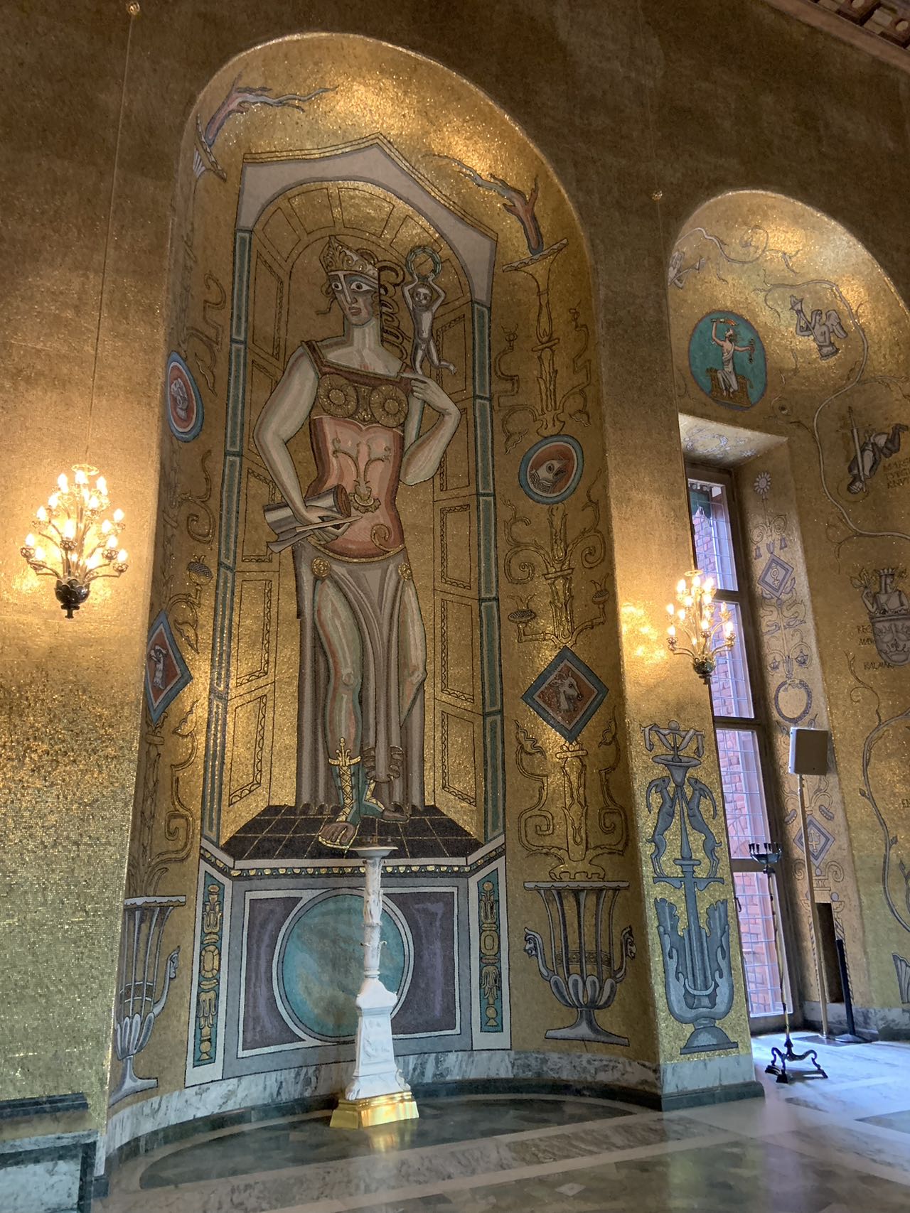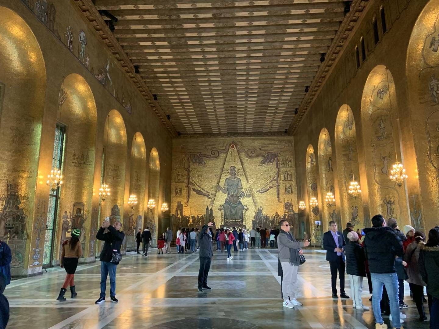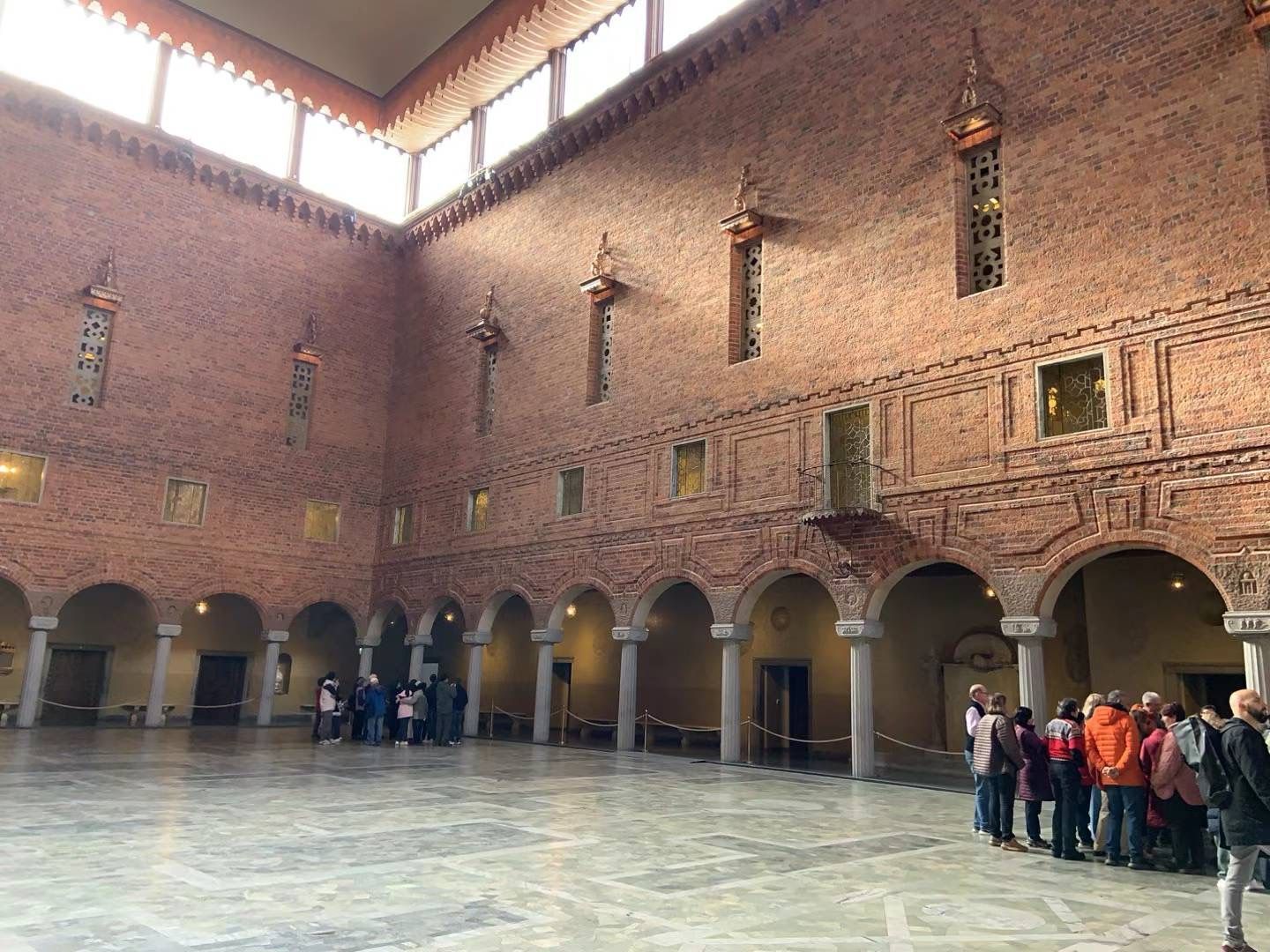 看过斯德哥尔摩市政厅后,还有什么市政厅值得一看呢?市政厅必须在讲解员带领下参观,十人以上。工作人员十分严格,要求由讲解员带领,导游压阵。建于1911-1923年的市政厅,位于市中心的梅拉伦湖畔,建筑两边临水,是一座红色砖瓦塔楼。右侧塔楼高106米,顶端为三个镀金皇冠,是瑞典王国的象征,也代表着当年卡尔马联盟三国 ---- 瑞典、挪威和丹麦。按照建筑师Ragnar Ostberg的设计,市政厅使用了800万块红砖。市政厅的金色大厅墙面和壁画,是用1800万块一厘米见方的金箔和各种彩色玻璃镶嵌而成,在灯光照射下,鎏金溢彩,金碧辉煌。金厅壁画描述了从维京海盗时代到近现代的发展,徜徉其间,瑞典的历史画卷徐徐展开。
