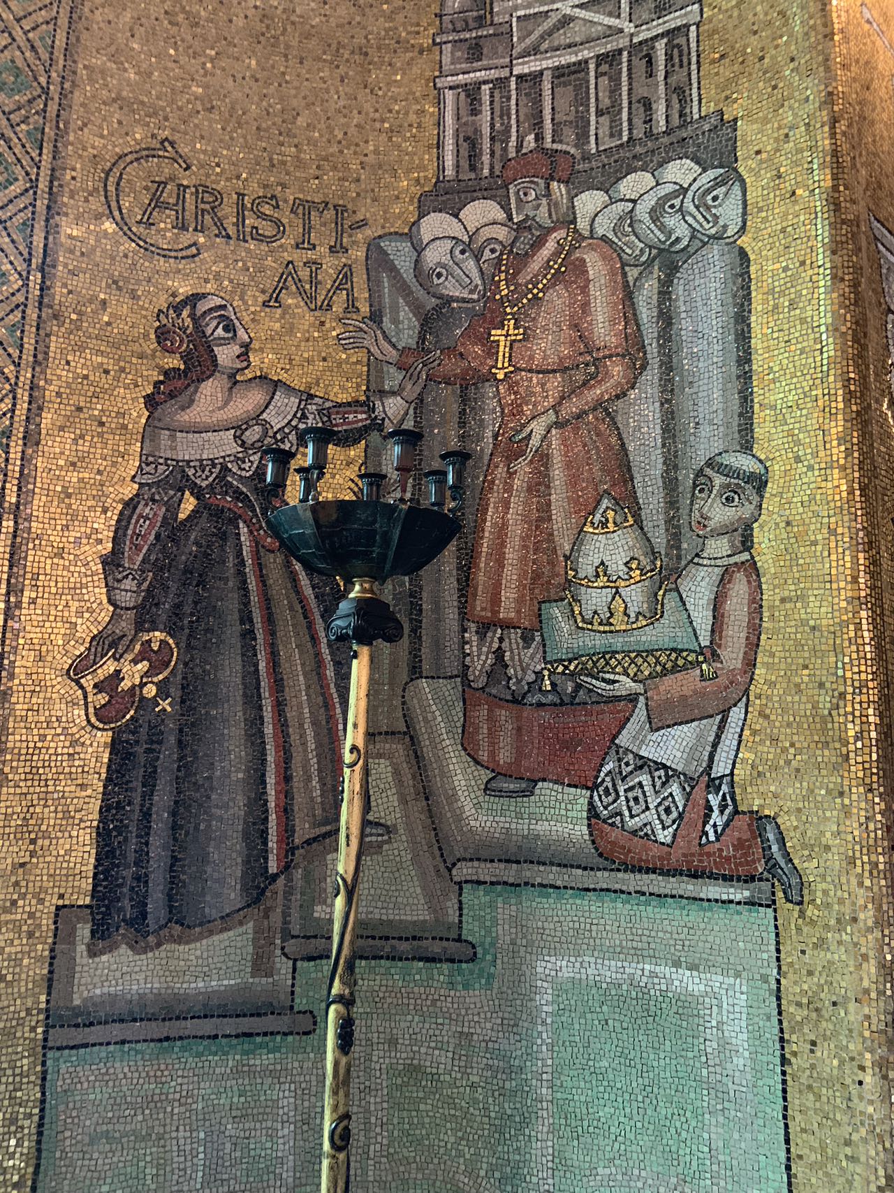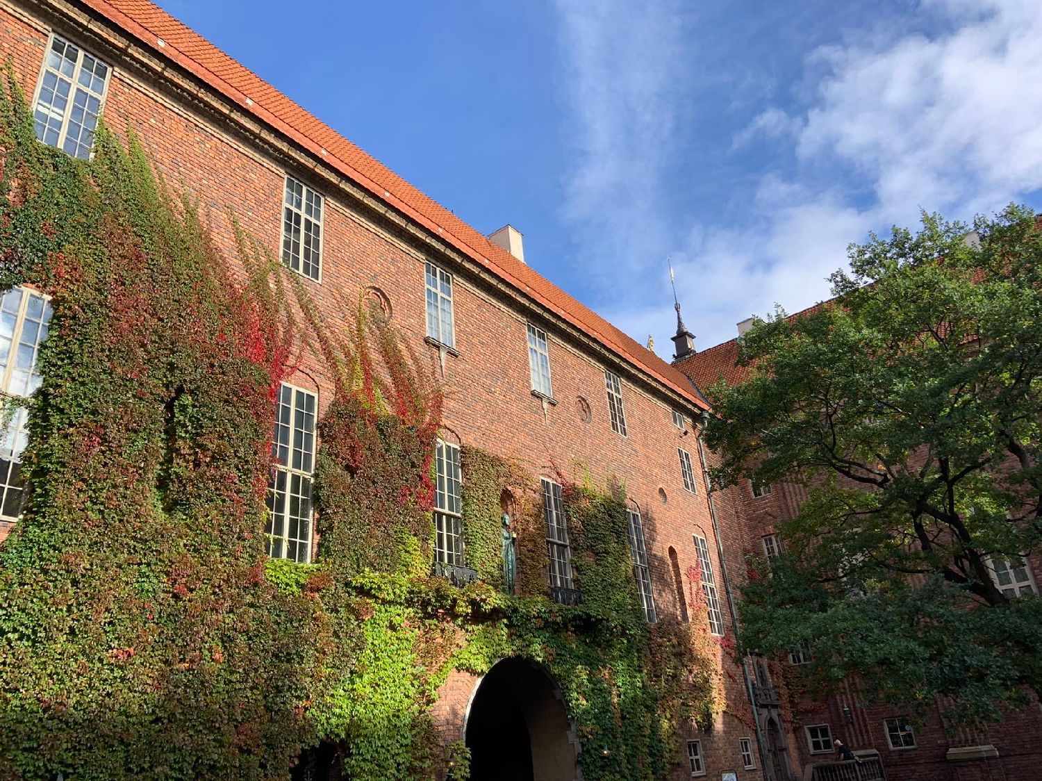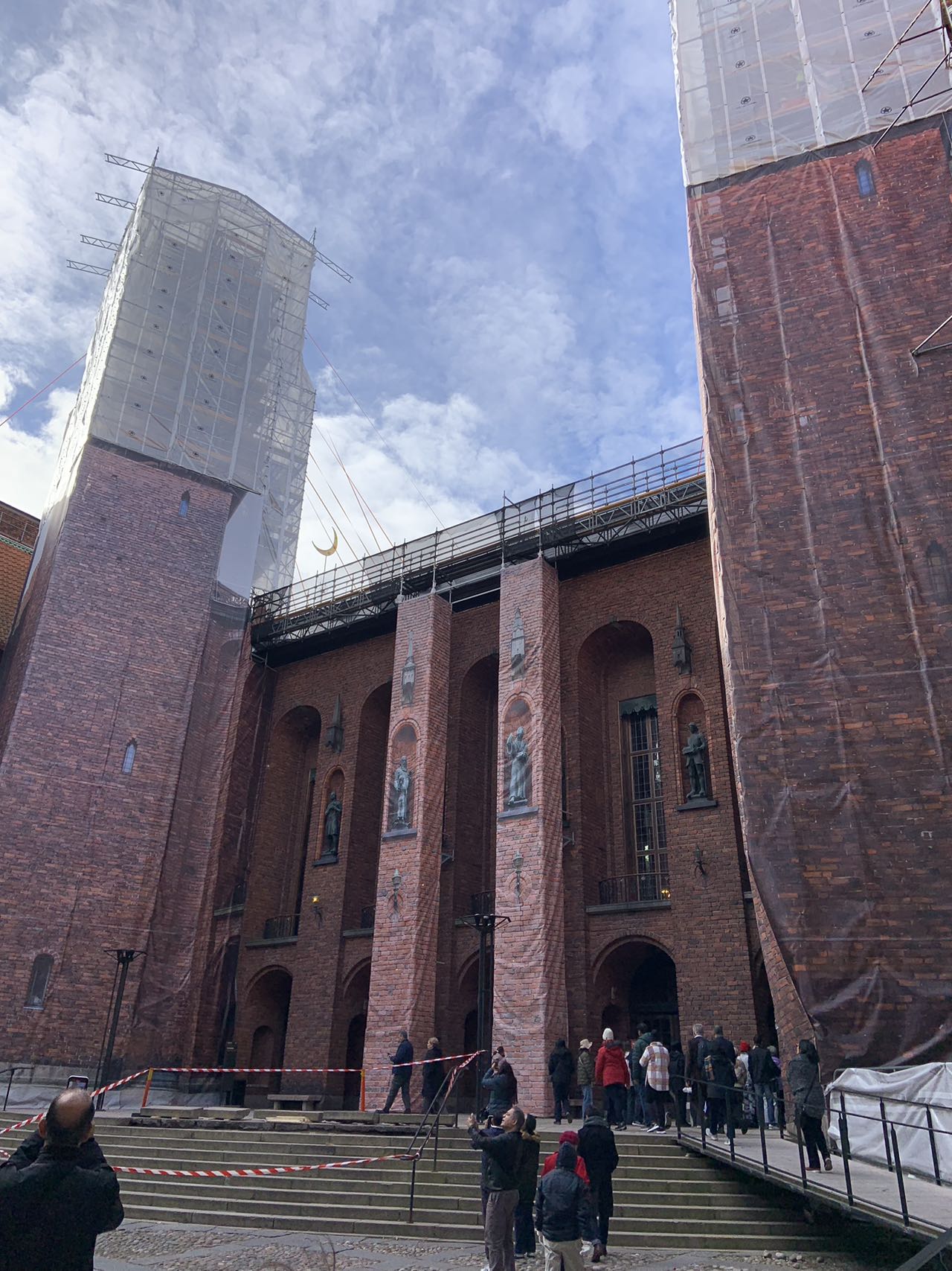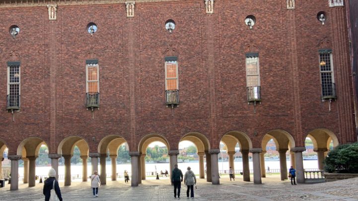 看过斯德哥尔摩市政厅后,还有什么市政厅值得一看呢?市政厅必须在讲解员带领下参观,十人以上。工作人员十分严格,要求由讲解员带领,导游压阵。建于1911-1923年的市政厅,位于市中心的梅拉伦湖畔,建筑两边临水,是一座红色砖瓦塔楼。右侧塔楼高106米,顶端为三个镀金皇冠,是瑞典王国的象征,也代表着当年卡尔马联盟三国 ---- 瑞典、挪威和丹麦。按照建筑师Ragnar Ostberg的设计,市政厅使用了800万块红砖。市政厅的金色大厅墙面和壁画,是用1800万块一厘米见方的金箔和各种彩色玻璃镶嵌而成,在灯光照射下,鎏金溢彩,金碧辉煌。金厅壁画描述了从维京海盗时代到近现代的发展,徜徉其间,瑞典的历史画卷徐徐展开。