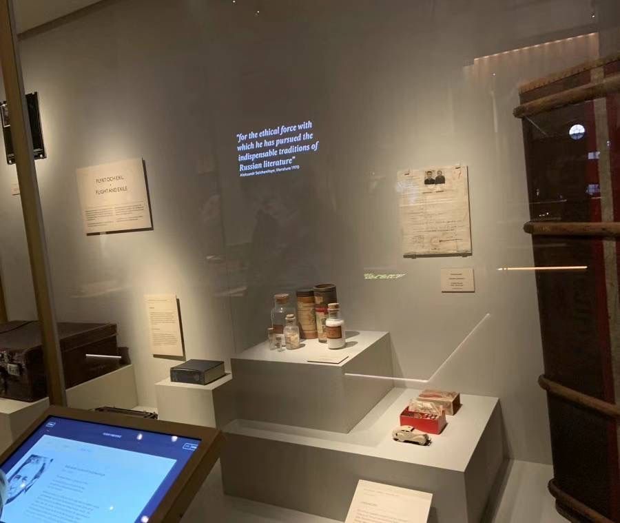在1970年文学奖获得者索尔仁尼琴的展柜墙上,有当年的颁奖词:“因其在追求俄罗斯文学不可或缺的传统时所具有的道义力量”(而被授予文学奖)。1970年,索尔仁尼琴的作品虽然获得诺贝尔奖,在国际上享有盛誉,却被国内封杀。作家因为在作品中抨击苏联社会弊端,而遭流放、受冷遇、被批判。获得诺贝尔文学奖的消息传到国内,苏联当局明确警告索尔仁尼琴说:出去后就别想再回国。于是他不得不致信斯德哥尔摩,出于个人原因放弃领诺贝尔奖。尽管如此,苏共中央书记处依然认为“授予亚·索尔仁尼琴1970年诺贝尔奖是挑衅行动”,并以叛国罪拘捕索尔仁尼琴。1974年2月,这位诺奖得主被强行押入飞机驱逐出境流亡国外。同年12月,索尔仁尼琴前往瑞典,领回了四年前就该属于他的殊荣。“我的一生苦于不能高声讲出真话。我的一生都在冲破阻拦而能够向公众讲出真话。”索尔仁尼琴如是说。被称作“俄罗斯良心”的索尔仁尼琴发表的著名获奖演讲《一句真话能比整个世界的分量还重》,至今依然振聋发聩,动人心魄。
