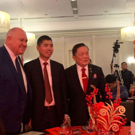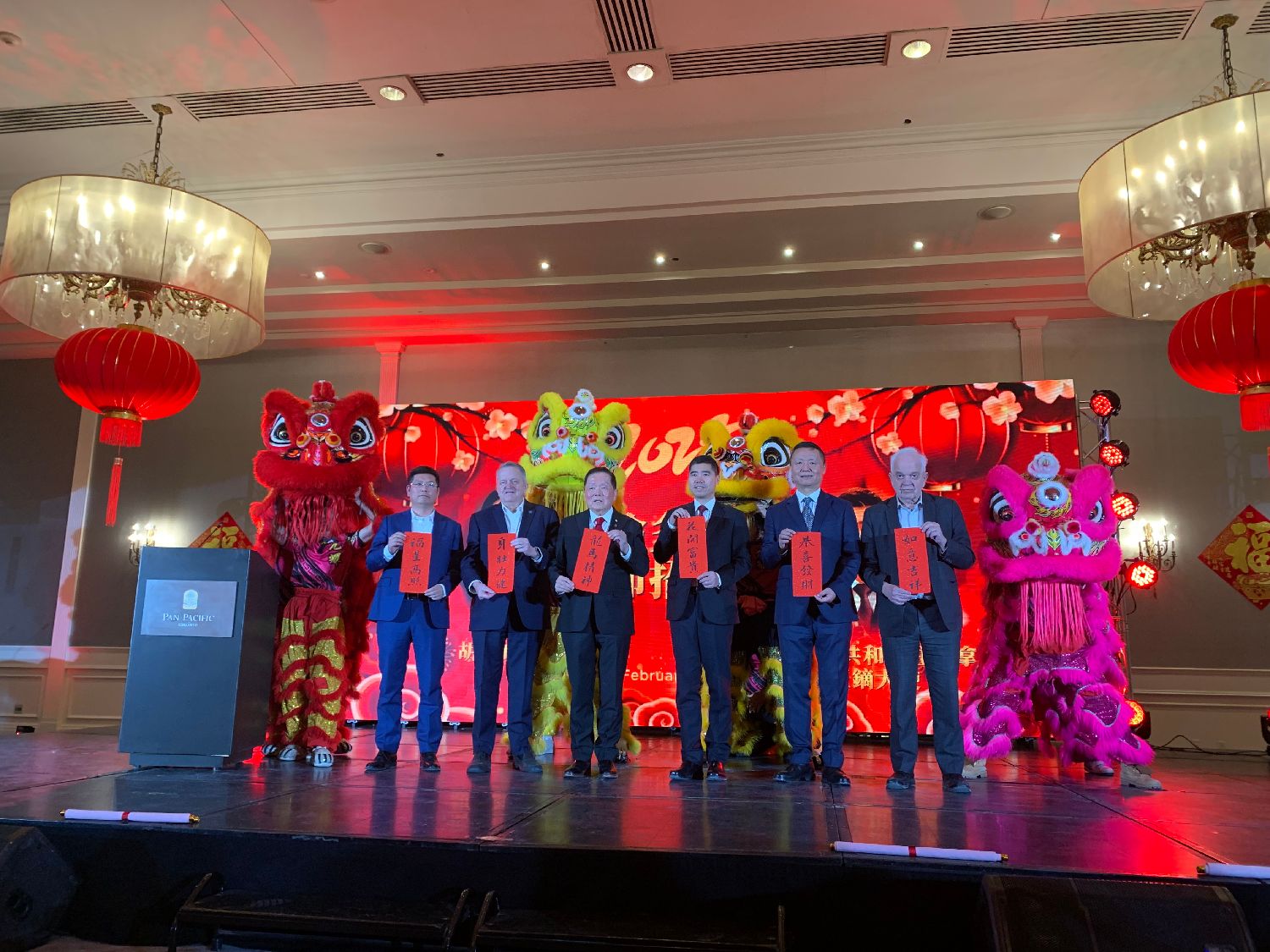 前加拿大联邦参议员胡子修(左3)与中国驻加拿大大使王镝(右3)与中国驻多总领馆总领事罗伟东(右2),前加拿大驻华大使麦家廉(右1),奥克维尔市长罗布·伯顿(左2),万丰集团董事长陈滨(左1)手持红色春联向来宾拜年