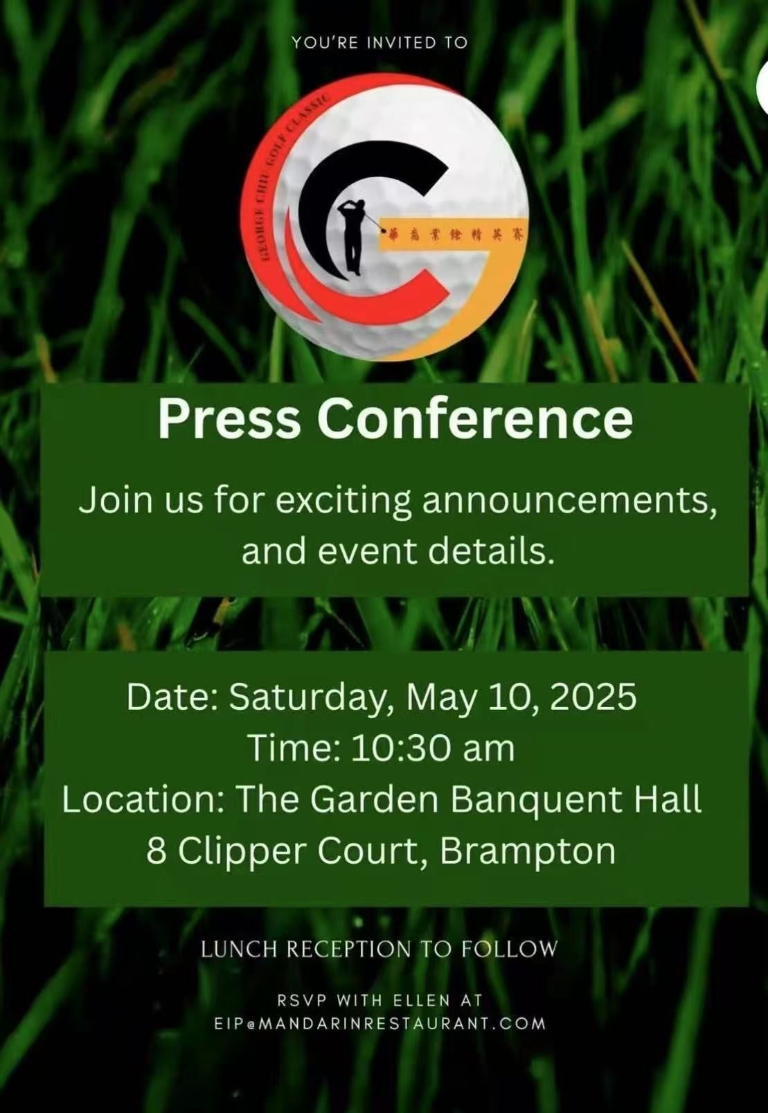 乔治·邱高尔夫精英赛组委会(George Chiu Golf Classic)于5月10日(星期六)中午在宾顿市(Brampton)