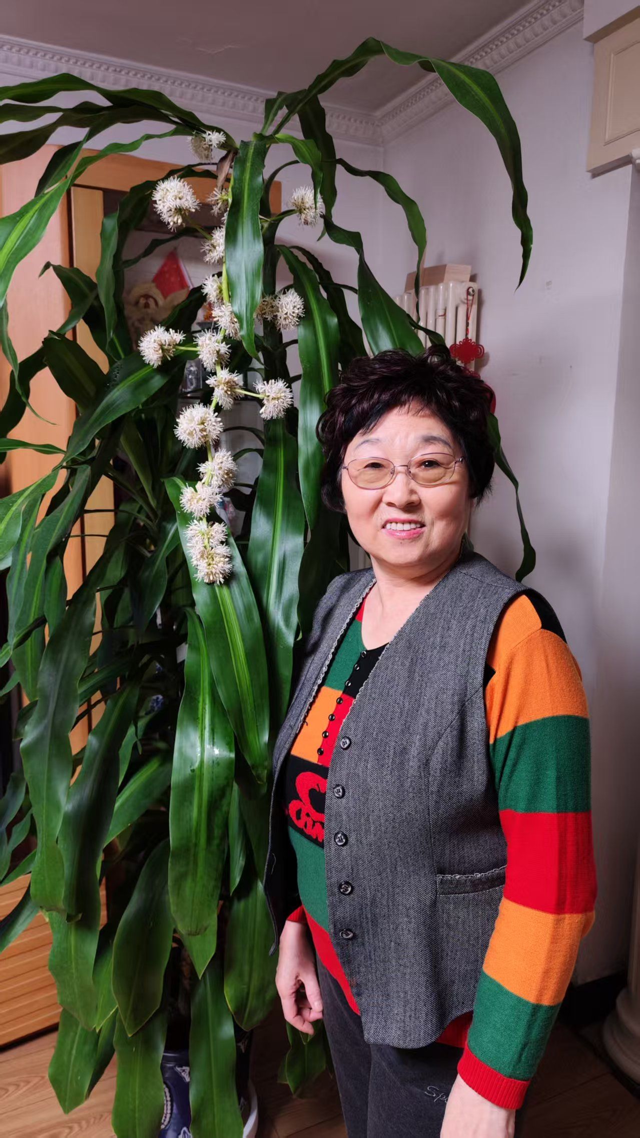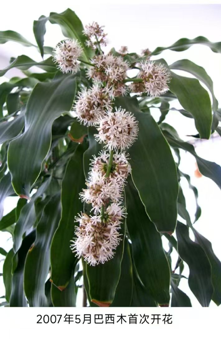 没过多久,一天早晨,我起床后闻到一股股浓烈的香气,起初还以为是家里的茉莉花开了,但味道又不大一样,走到大厅一看,原来是巴西木的花苞绽放了!花朵像一个个白色的小灯笼,垂挂在花梗上,凑近深吸一口气,香气浓郁得几乎让人有些受不了,我忍不住激动地喊起来:“快来看啊!巴西木开花儿啦!”家人们闻声赶来,有的凑近闻闻,有的轻轻摸摸,大家围在一起,兴奋非凡,仿佛庆祝巴西木,于2007年5月,首次开花展览会场面。真没想到巴西木开花竟是这样的景象,香气弥漫整个房间,这是我第一次见到它开花,观察了几天,发现它的花球白天闭合,傍晚五六点钟才缓缓绽放,这是不是该叫“夜来香”呢?起初还担心这浓烈的香气对身体有害,但查阅资料显示,它不仅无毒,还会吸收室内的二甲苯、三氯乙烯和甲醛等有害气体,非常适合室内养护。第二年,巴西木再次开花,依然香气扑鼻,第三年它依旧如期绽放,而且越长越高,修剪时甚至要站在凳子上才能够得到了。