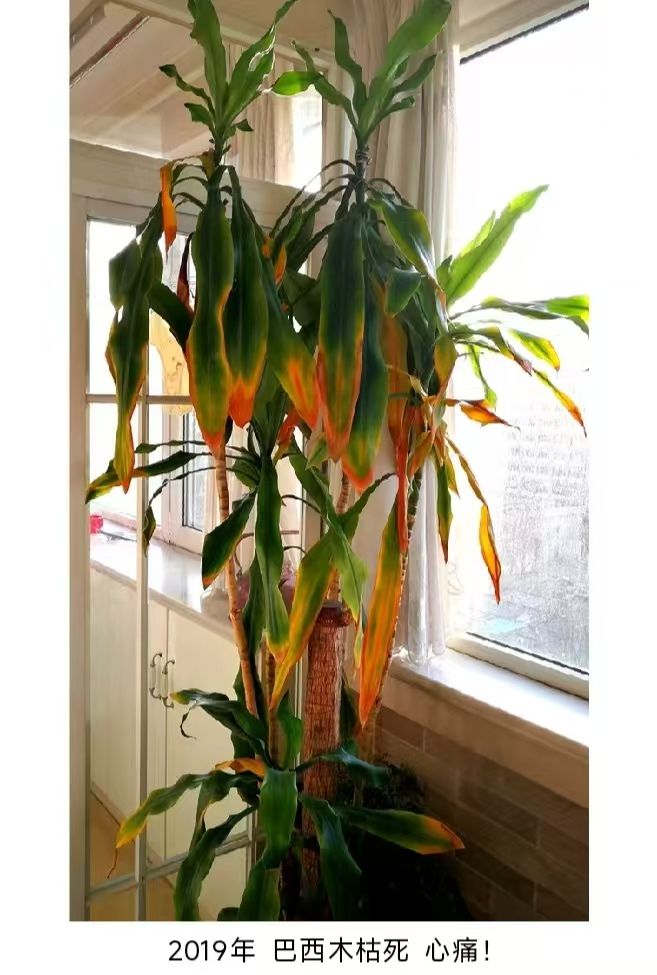 2019年,这棵巴西木不知何故,叶子慢慢变黄,一点点枯萎,看着它慢慢枯萎死了。我痛之一时,心有不甘那,与它朝夕相处17年,可能是老了吧,人都有生老病死,何况植物呢!