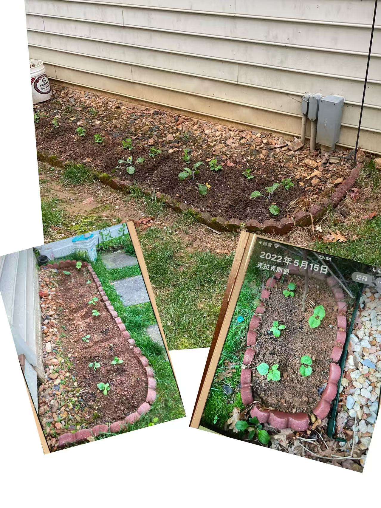 看着房后、车库前的草地,观察着春夏时节,每天日照有3至4小时,萌生这土里可种瓜菜的想法,于是,每天早上10点,边晒太阳边用小铲子挖石子。车库前挖出一条用脚丈量长宽25x5步的一条土地来。挖翻时冒出来的泥土味,让我闻出与久远故乡相同气味来,勾起童年与哥哥开荒挖石子的往事,那景那情飘然而来……