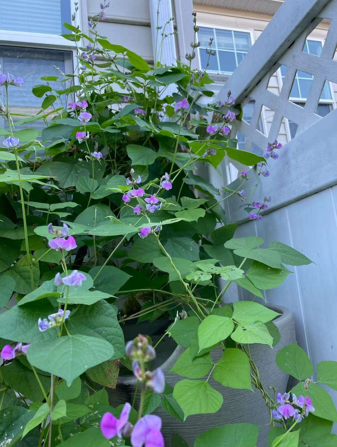 平整土地后,第一年想种点什么好?首想种,儿子爱吃的扁豆,也见过老家天井的一棵树下种的扁豆,那豆籐蔓顺着小树爬得好高让太阳直照,开出朵朵紫小花,随风飘动很漂亮,想这豆我会种。打听到邻居重庆籍周老师有扁豆苗,她给了我两颗秧,用枯树枝搭架,让它顺杆向上爬,见更多阳光。五月开出紫花朵朵,花蕊是白色,没几天小豆荚出现,自己种的当摘最嫩的炒给儿子吃。我曾纳闷为什么儿子爱吃这扁豆?多数人不爱吃,因这豆皮纤维粗,拉嗓子。一次与儿子去中国超市买菜,他发现扁豆可高兴,我一看都老了,但,那就买吧!当年他父亲也有一次在北京天和菜市场发现有扁豆,如发现新大陆似的,那开心劲儿。我一看是不鲜而老豆了,说买半斤吧,他说都要了,一称共三斤,我说我不吃,你一个人吃哦,先生确实吃了好几天都不腻。在异国地里,第一年就种两株扁豆,六至八月几乎每周都可炒一盘,儿子也是百吃不厌,觉得好奇?我寻思基因遗传是一个方面,还有一方面,那是我妈摘自家天井种的扁豆,蒸煮稀烂喂刚出一对牙的外甥,让他人生第一次舔尝咸味蔬菜,想来比奶粉有味,那味觉留存于幼儿脑海深处吧。这年秋后,收了许多老扁豆熬粥,发现孙女们不喜欢吃嫩扁豆,却在粥里挑黑扁老豆吃,说这豆皮厚,豆肉比其他豆香,如此,情有独钟,三代人都爱,我只留了六粒种子,其余当年都吃光。