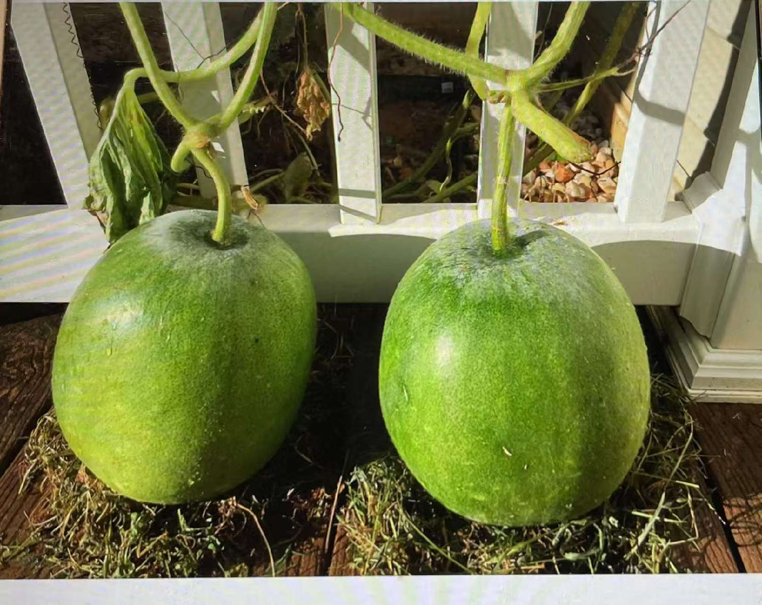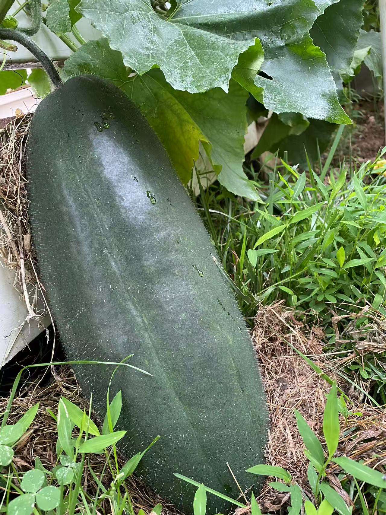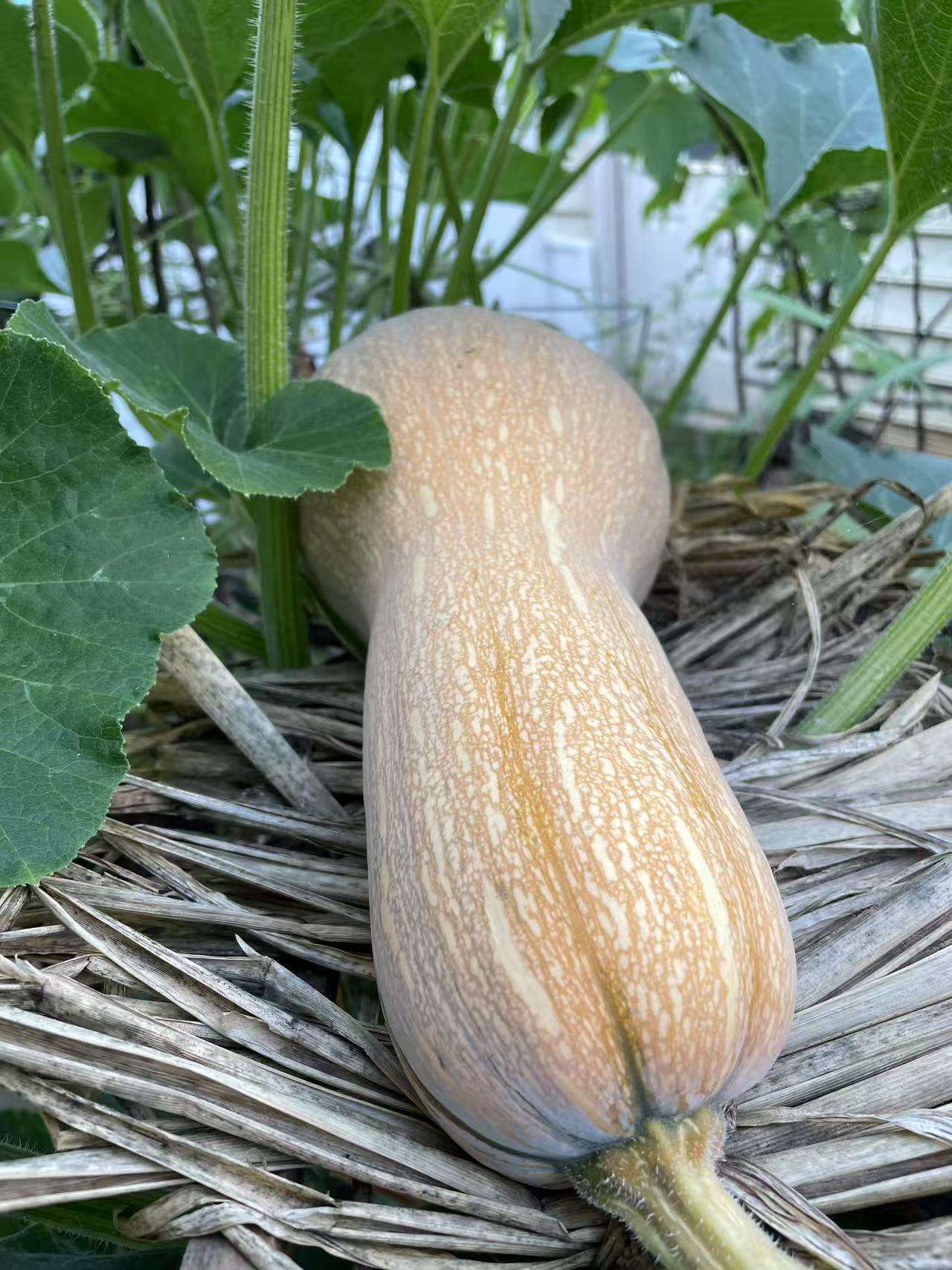泥土真好,在北屋墙边又挖一条长宽15x3步的地。这块地的日照更少,第一年从超市买来的冬瓜挖子试种,瓜藤由我摆布,让它绕弯向着阳光照射多一点的台阶护栏上穿梭开花,当年结下一个冬瓜,与买来的母瓜品相一个样。第二年,邻居孙姐送我青皮大冬瓜子,竟然长得像个小孩那么大,我都抱不动,称重25磅。2021年,买来日本南瓜也是挖子种,孩子们爱吃嫩南瓜下锅做面疙瘩,市场是买不到嫩南瓜。每年何时下种,怎样管理,用本子记录,这年共收10个南瓜。2024年种了二棵中国南瓜,在穿过台阶护栏给搭“二层架楼”,一个南瓜平卧二个多月,天天早晨起来在窗口能欣赏它慢慢由青变黄,朋友每次看到都说,你像护理孩儿一样,南瓜下面还给舖草垫,这是什么草呀?这南瓜长在你家太舒服,下有垫子,上有太阳晒。噢,垫的茭白干草叶子,也是自产的。