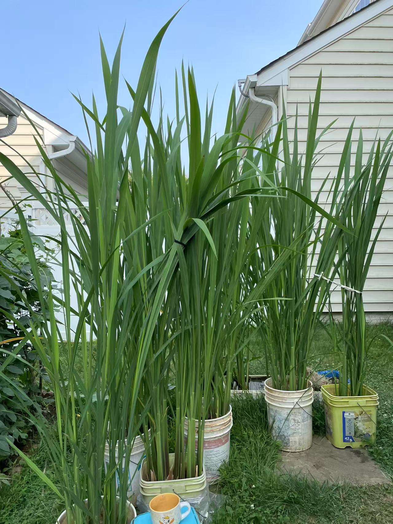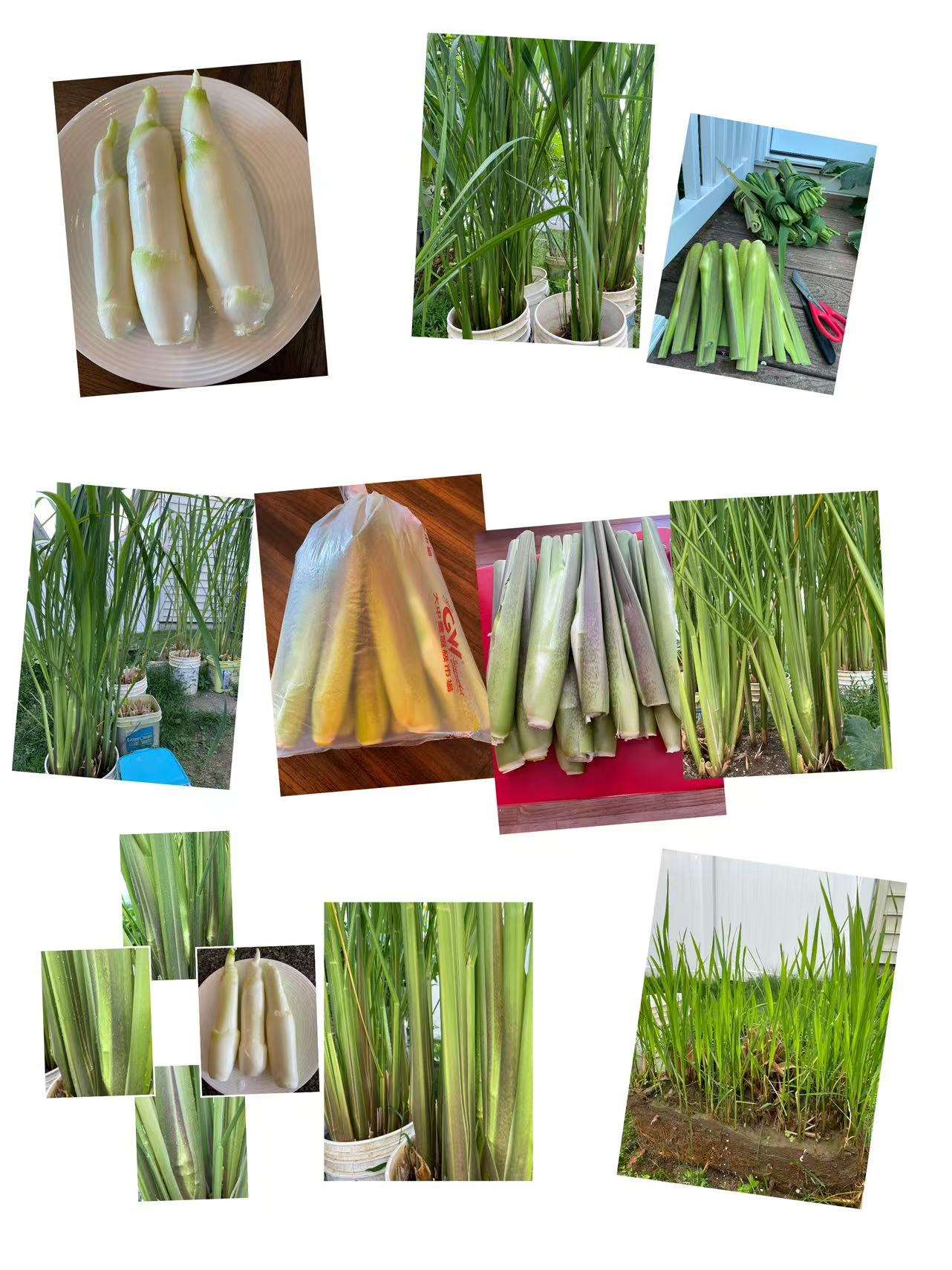 2020年与儿子在中国超市看到茭白,我俩都喜悦,哟!10美金一磅,物以稀为贵,只买一根,回家一看,保鲜膜包裹了多层,且不鲜又干瘪。第二年打听到,后院福建郑家种茭白,郑家夫人给了5枝茭白苗,郑先生送水桶又教如何种,当年收了10根,试种成功,信心满怀,茭白不占地土,用桶种养。自挖的那两条地还是小,这下可好,向空间发展,在每块走路的方石块上放一个水桶,摆放十几桶。六七月份,2米高的翠绿色茭白叶,如丝带似的随风飘舞,左右邻舍是墨西哥和美籍人,他们在楼上也能观赏到,但不知何物,九月收获时,送给他们尝鲜,用“有道翻译”把英语写在纸条上,教他们怎么做吃,墨西哥奶奶竟然会说“茭白”两字了。右边美国家庭男主人是黑色人种,用手机英译中与我交流。
