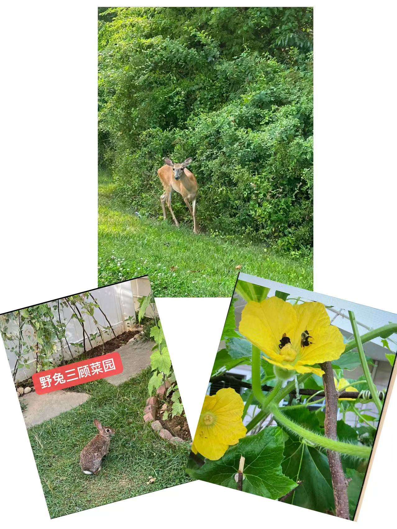 还有,如野兔这样的动物,几乎天天来逛菜院,曾四周用带刺枝条封堵,它很聪明,能趴下钻进来,在门下用笨重木板封住,它在木板下打地洞进来,真让我认识狡兔三窟,那咱就和平相处,它没搞大的破坏,发现爱吃草坪中的一种草,就让它天天来吧,它不怕我,有时还给照个相。破坏性最大是鹿,它若进院,那就一片狼藉,儿子给装了门,万无一失。