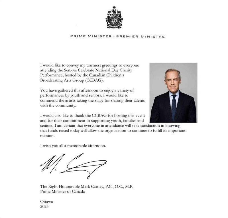 加拿大总理马克·卡尼发来贺信表示祝贺,他在贺信中指出:“我谨向所有参加由加拿大儿童广播艺术团体(CCBAG)主办的“老年人庆祝国庆慈善演出”的各位致以最热烈的问候。