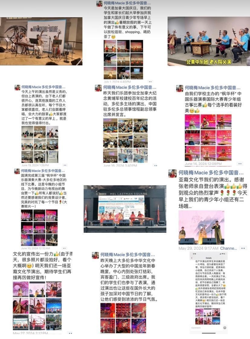 乐团自成立以来,在何晓梅团长的带领下,不仅有每年在当地的专场演出,而且也受邀回国义演,以及日本和欧美的巡演;同时该团非常具有公益心和社会责任感,活跃参加中加文化交流活动,常年服务社区,提供一些慈善义演,比如,为老人院义演,安大略省博物馆内一连三场的中国民乐表演,而且献艺亚裔文化节、加拿大纪念黄埔军校建校百年纪念的活动等等。