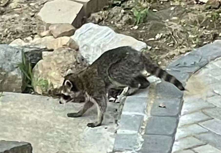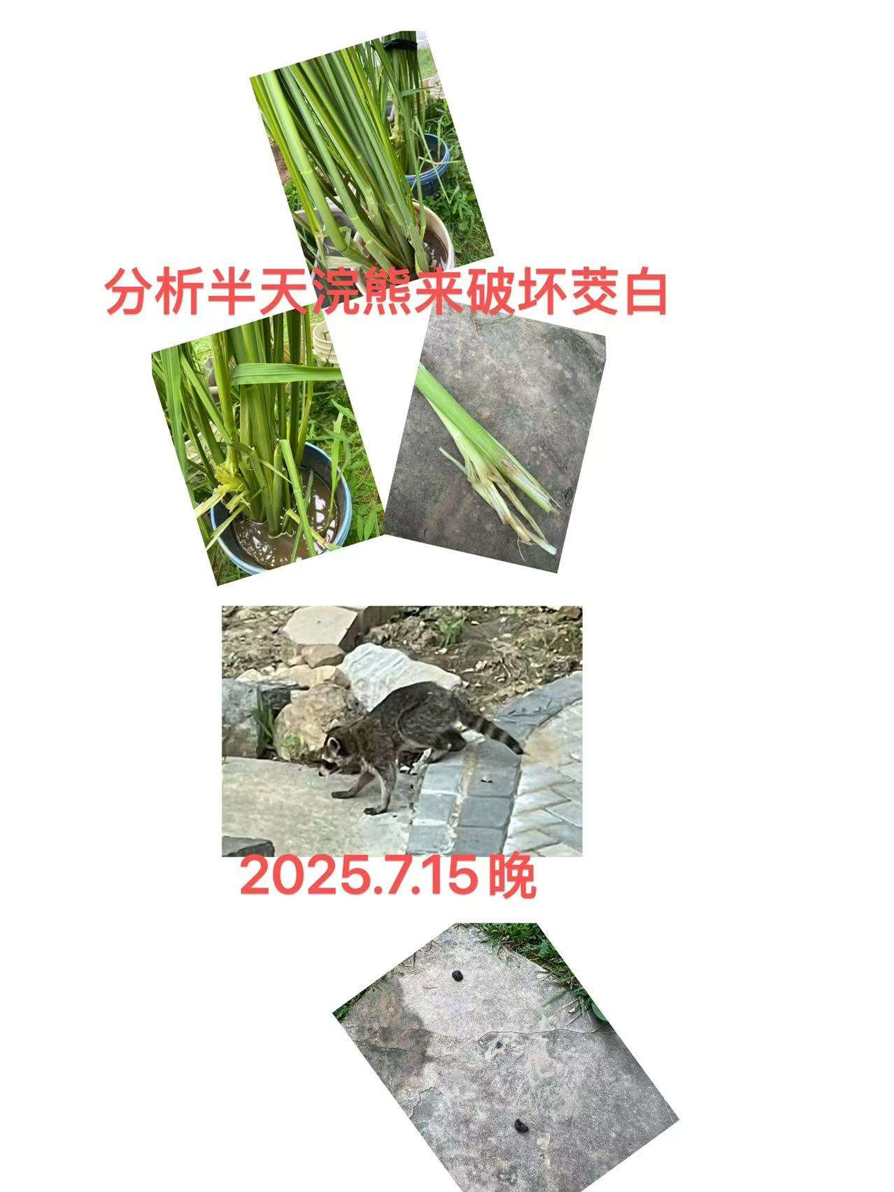 儿子帮分析又安慰,我说前段时间分别有过2次小伤,我当刮风吹倒的,给茭白叶扶直,用绳子绑住疗伤。这次,肯定不是风吹倒,昨晚没刮风下雨啊!我说是蛇么?那么一大片被扫荡,儿说,要多大的蛇,不可能。他说要么是鹿,我说后院门那么高,它跳不进来,儿说鹿能跳过你人头高呢,我说鹿若来,其他作物怎么不损坏呢。后来发现地上有屎,我拍了照片,儿子分析说也许是浣熊。我不知该动物,从没听说过,也没见过。儿子给我发来他曾拍到过浣熊的照片。
